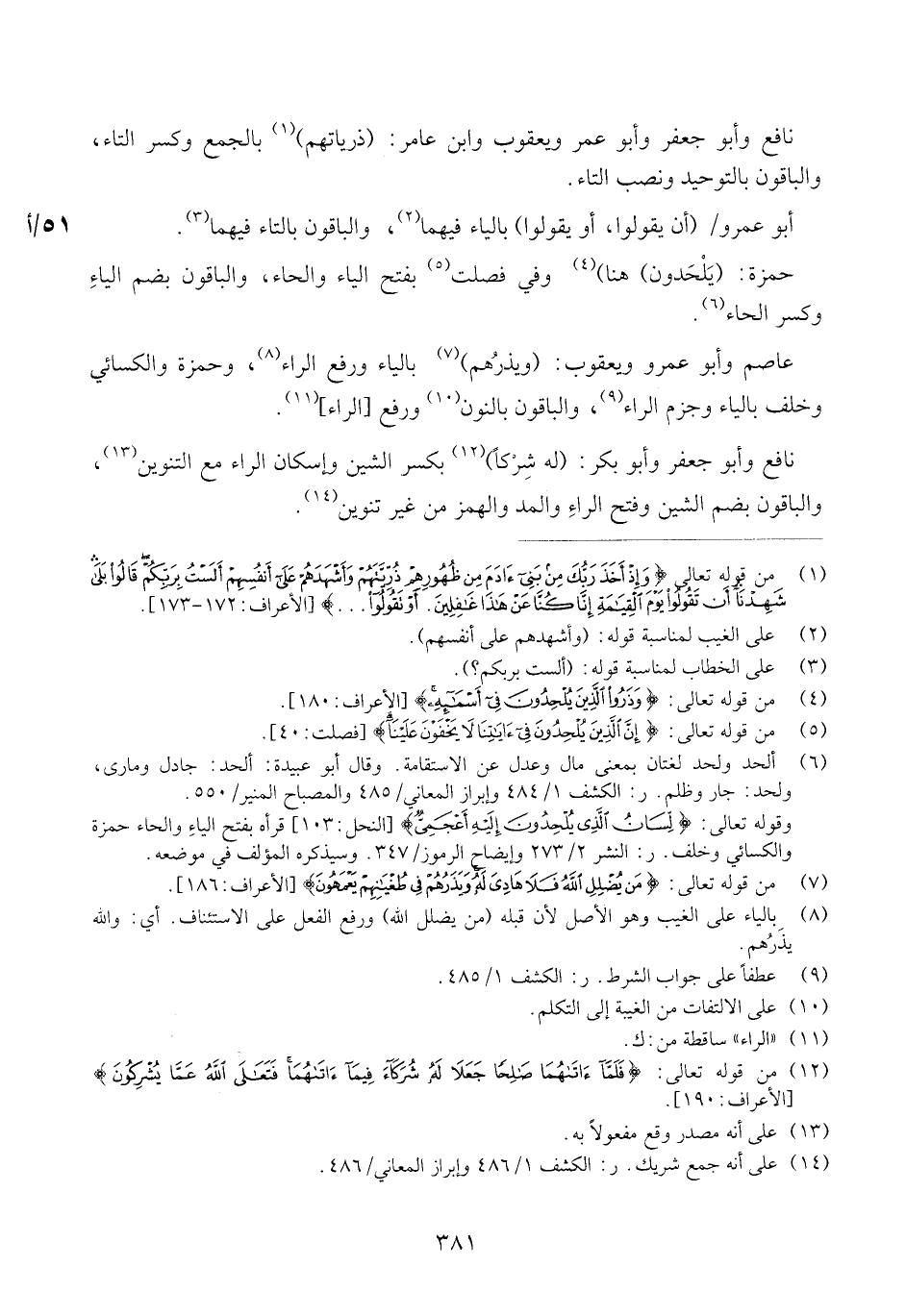 ابْن كثير وَأَبُو بكر وَأَبُو عَمْرو وَابْن عَامر وَيَعْقُوب: (مرجئون) هُنَا وَفِي الْأَحْزَاب: (ترجىء) بِالْهَمْز فيهمَا، وَالْبَاقُونَ بِغَيْر همز.