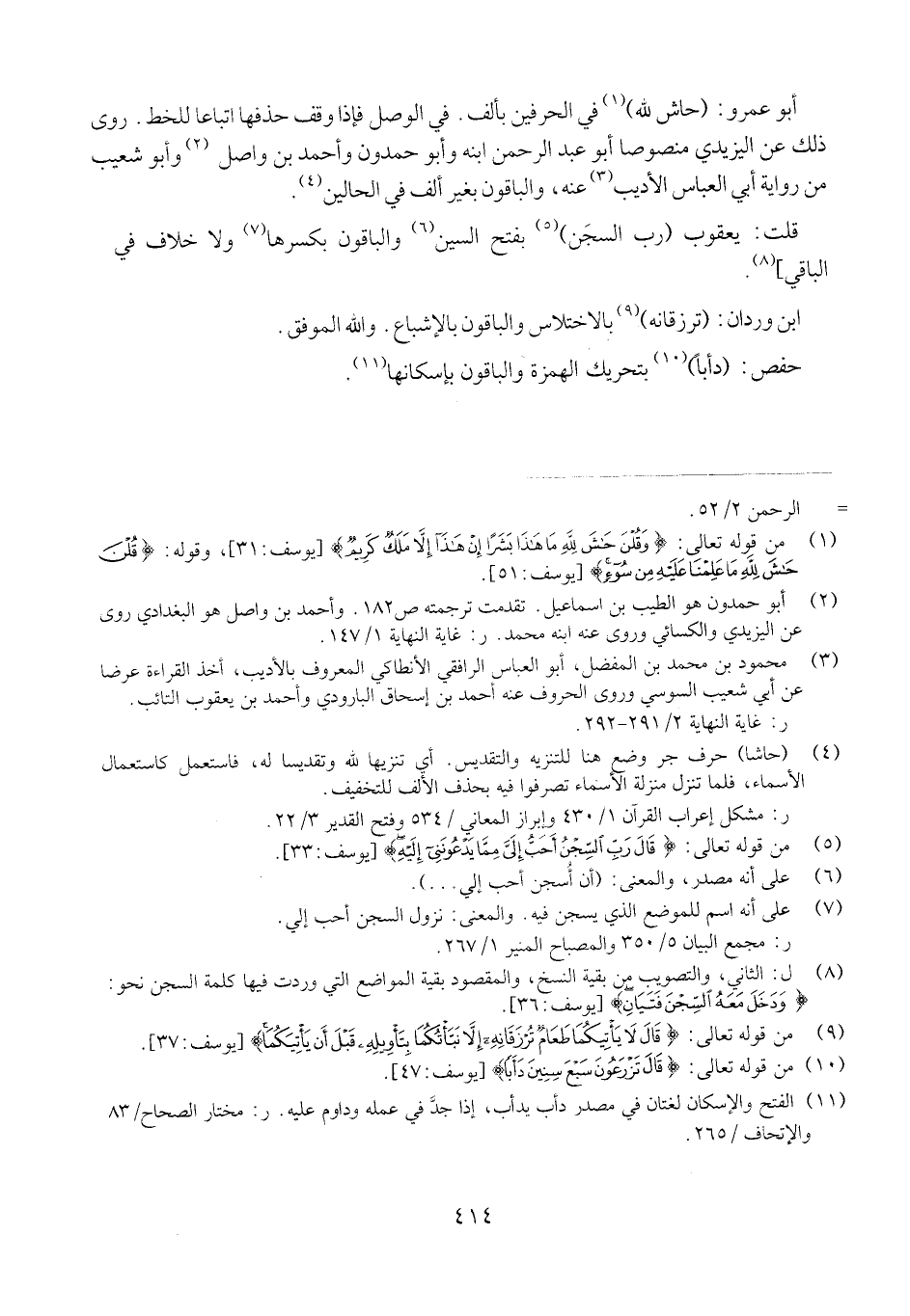 وفيهَا ثَلَاث محذوفات: (وَخَافَ وَعِيد) أثبتها فِي الْوَصْل ورش فِي الْحَالين يَعْقُوب.