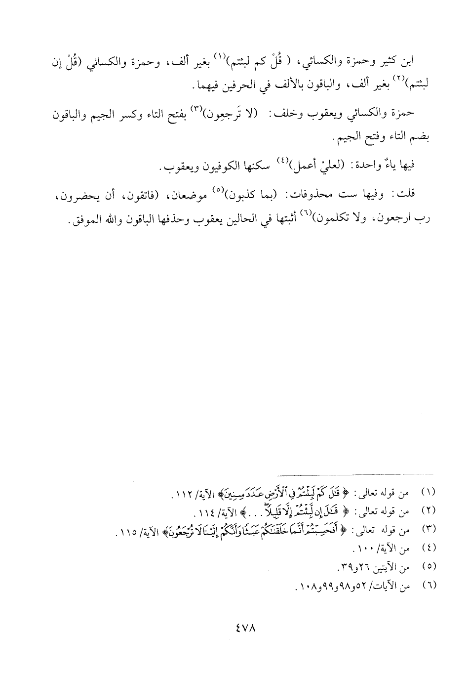 (بعبادي إِنَّكُم) ، فتحهَا نَافِع وَأَبُو جَعْفَر. (إِن معي رَبِّي) فتحهَا حَفْص، (عَدو لي إِلَّا رب، لأبي إِنَّه) فتحهما نَافِع وَأَبُو جَعْفَر وَأَبُو عَمْرو (وَمن معي) فتحهَا ورش وَحَفْص، (إِن أجري إِلَّا) فِي الْخَمْسَة فتحهن نَافِع وَأَبُو جَعْفَر وَابْن عَامر وَأَبُو عَمْرو وَحَفْص.