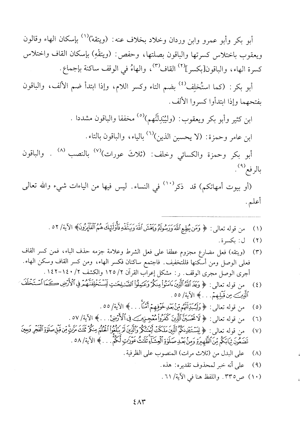 الْهَاء وَألف بعْدهَا (الْعمي) بالخفض ووقفوا هُنَا بِالْيَاءِ وَفِي الرّوم بِغَيْر يَاء اتبَاعا للمصحف حاش الْكسَائي وَيَعْقُوب فَإِنَّهُمَا وَقفا عَلَيْهَا بِالْيَاءِ.