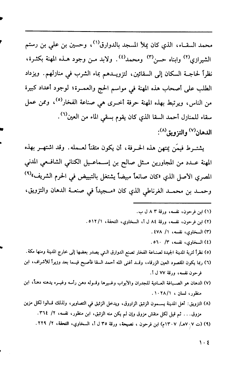محمد السقاء، الذي كان يملأ المسجد بالدوارق (1)، وحسين بن علي بن رستم الشيرازي (2) وابناه حسن (3) ومحمد (4). ولا بد من وجود هذه المهنة بكثرة، نظراً لحاجة السكان إلى السقائين، لتزويدهم بماء الشرب في منازلهم. ويزداد الطلب على أصحاب هذه المهنة في مواسم الحج والعمرة؛ لوجود أعداد كبيرة من الناس، ويرتبط بهذه المهنة حرفة أخرى هي صناعة الفخار (5)، وممن عمل سقاء للمنازل أحمد السقا الذي كان يقوم بسقي الماء من العين (6).