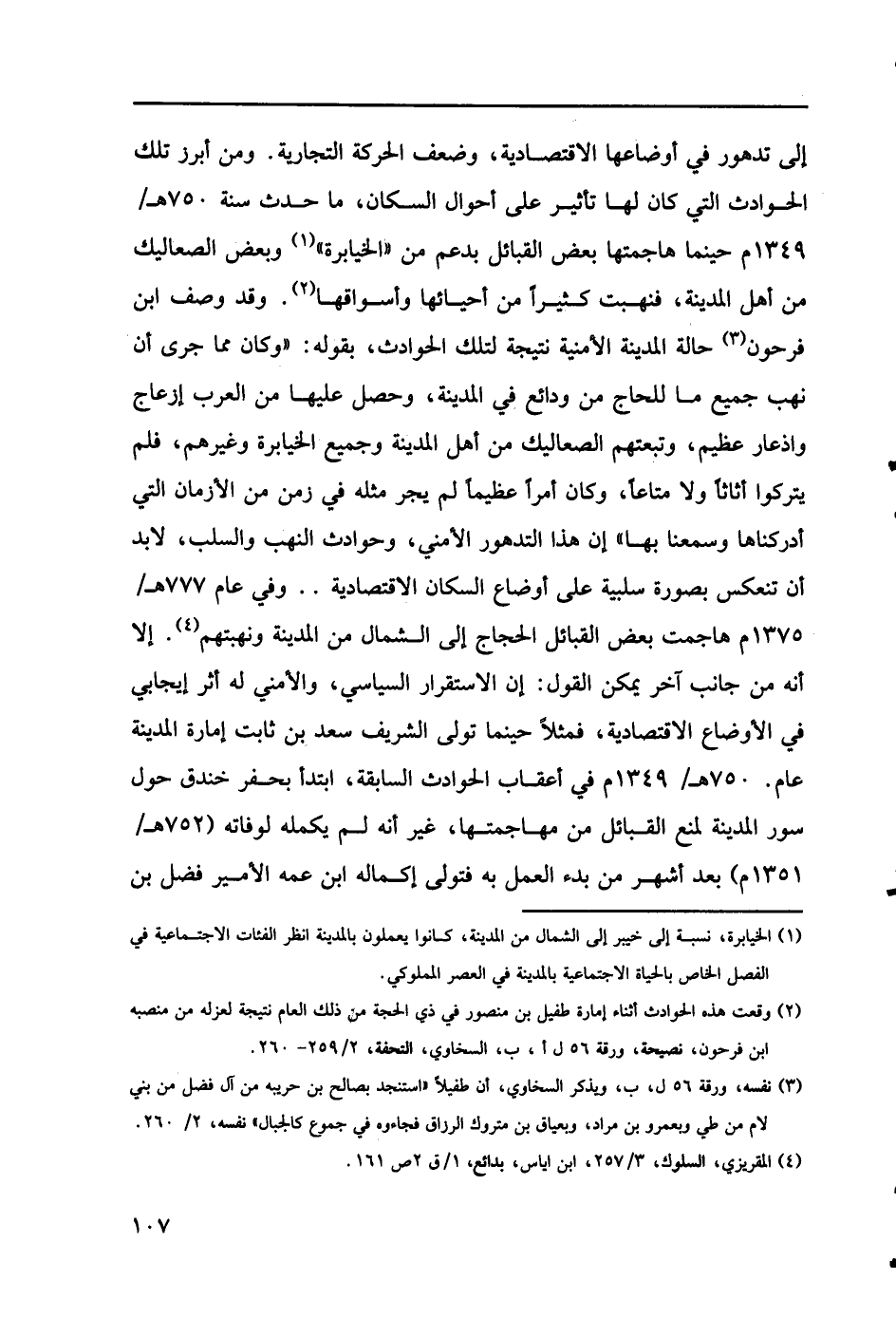 إلى تدهور في أوضاعها الاقتصادية، وضعف الحركة التجارية. ومن أبرز تلك الحوادث التي كان لها تأثير على أحوال السكان، ما حدث سنة 750هـ/1349م حينما هاجمتها بعض القبائل بدعم من "الخيابرة " (1) وبعض الصعاليك من أهل المدينة، فنهبت كثيراً من أحيائها وأسواقها (2). وقد وصف ابن فرحون (3) حالة المدينة الأمنية نتيجة لتلك الحوادث، بقوله: "وكان مما جرى أن نهب جميع ما للحاج من ودائع في المدنية، وحصل عليها من العرب إزعاج واذعار عظيم، وتبعتهم الصعاليك من أهل المدينة وجميع الخيابرة وغيرهم، فلم يتركوا أثاثاً ولا متاعاً، وكان أمراً عظيماً لم يجر مثله في زمن من الأزمان التي أدركناها وسمعنا بها" إن هذا التدهور الأمني، وحوادث النهب والسلب، لا بد أن تنعكس بصورة سلبية على أوضاع السكان الاقتصادية .. وفي عام 777هـ/1375م هاجمت بعض القبائل الحجاج إلى الشمال من المدينة ونهبتهم (4). إلا أنه من جانب آخر يمكن القول: إن الاستقرار السياسي، والأمني له أثر إيجابي في الأوضاع الاقتصادية، فمثلاً حينما تولى الشريف سعد بن ثابت إمارة المدينة عام. 750هـ/1349م في أعقاب الحوادث السابقة، ابتدأ بحفر خندق حول سور المدينة لمنع القبائل من مهاجمتها، غير أنه لم يكمله لوفاته (752هـ/1351م) بعد أشهر من بدء العمل له فتولى إكماله ابن عمه الأمير فضل بن