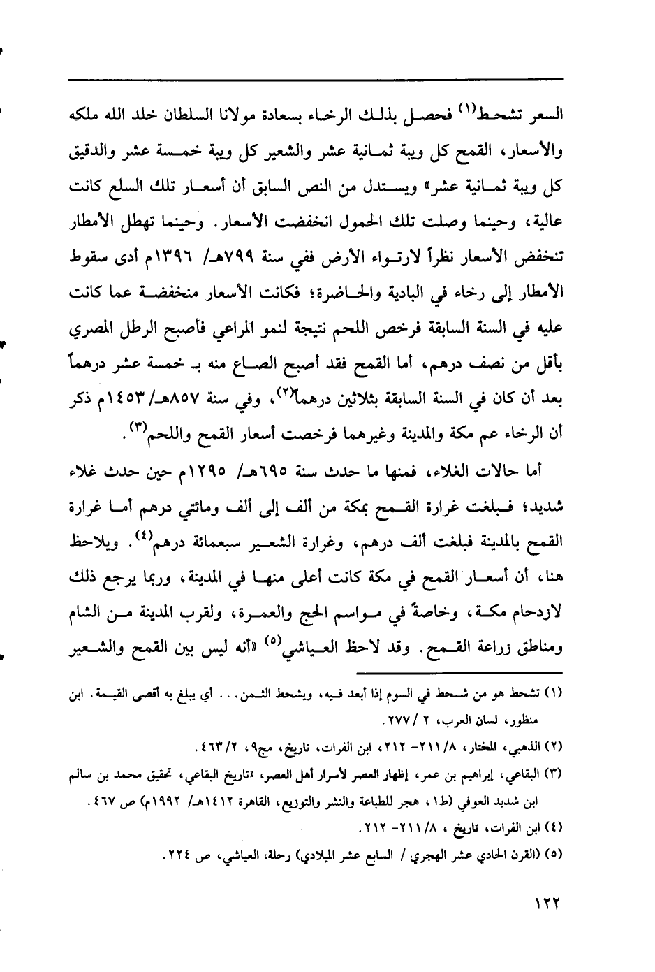 أما حالات الغلاء، فمنها ما حدث سنة 695هـ/1295م حين حدث غلاء شديد؛ فبلغت غرارة القمح بمكة من ألف إلى ألف ومائتي درهم أما غرارة القمح بالمدينة فبلغت ألف درهم، وغرارة الشعير سبعمائة درهم (4). يلاحظ هنا، أن أسعار القمح في مكة كانت أعلى منها في المدينة، وربما يرجع ذلك لازدحام مكة، وخاصةً في مواسم الحج والعمرة، ولقرب المدينة من الشام ومناطق زراعة القمح. وقد لا حظ العياشي (5) "أنه ليس بين القمح والشعير