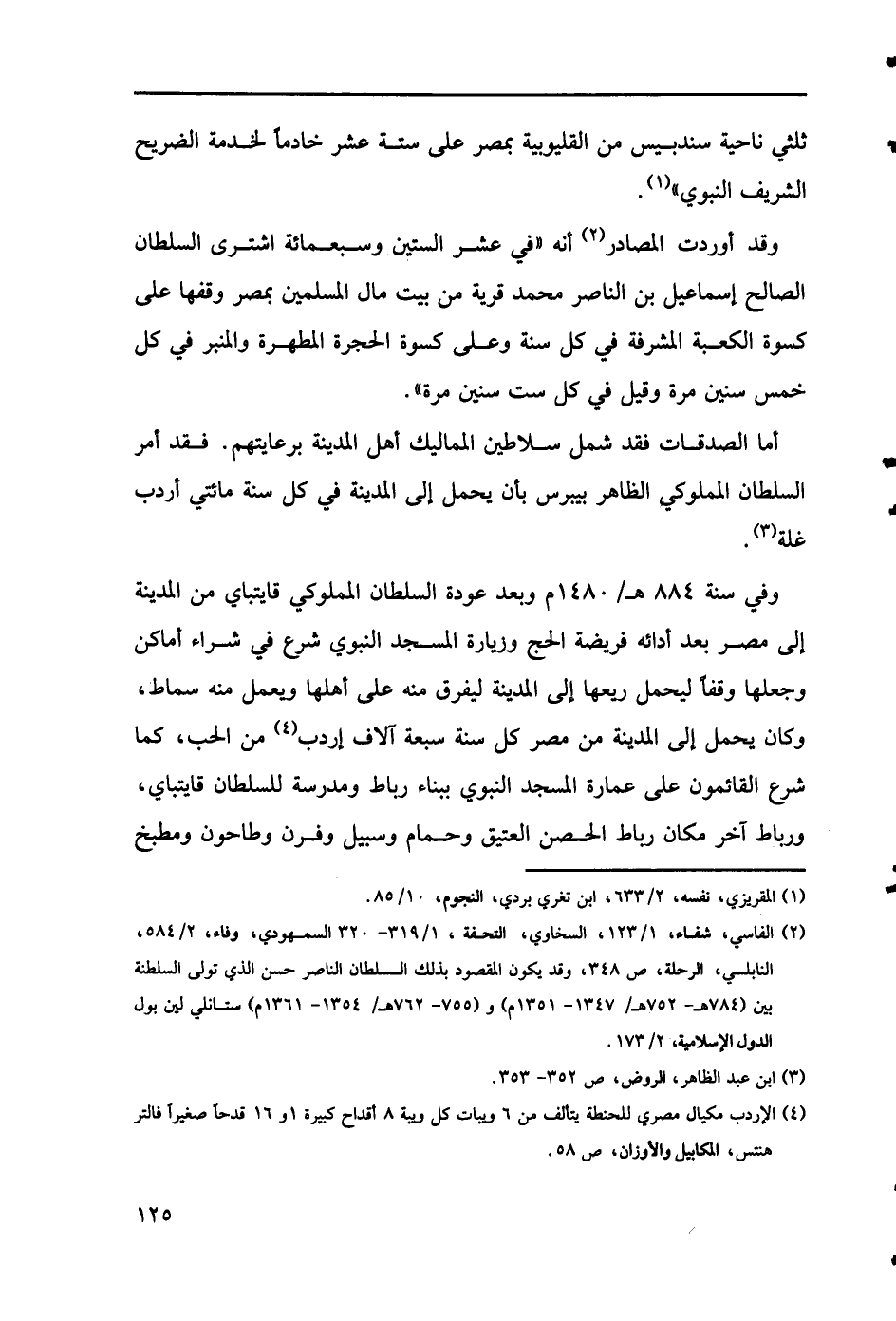 (2) الفاسي، شفاء، 123/ 1، السخاوي، التحفة، 319/ 1 - 320 السمهودي، وفاء، 584/ 2،النابلسي، الرحلة، ص348، وقد يكون المقصود بذلك السلطان الناصر حسن الذي تولى السلطنة بين (784هـ-752هـ/1347 - 1351م) و (755 - 762هـ/1354 - 1361م) ستانلي لين بول الدول الإسلامية، 173/ 2.
