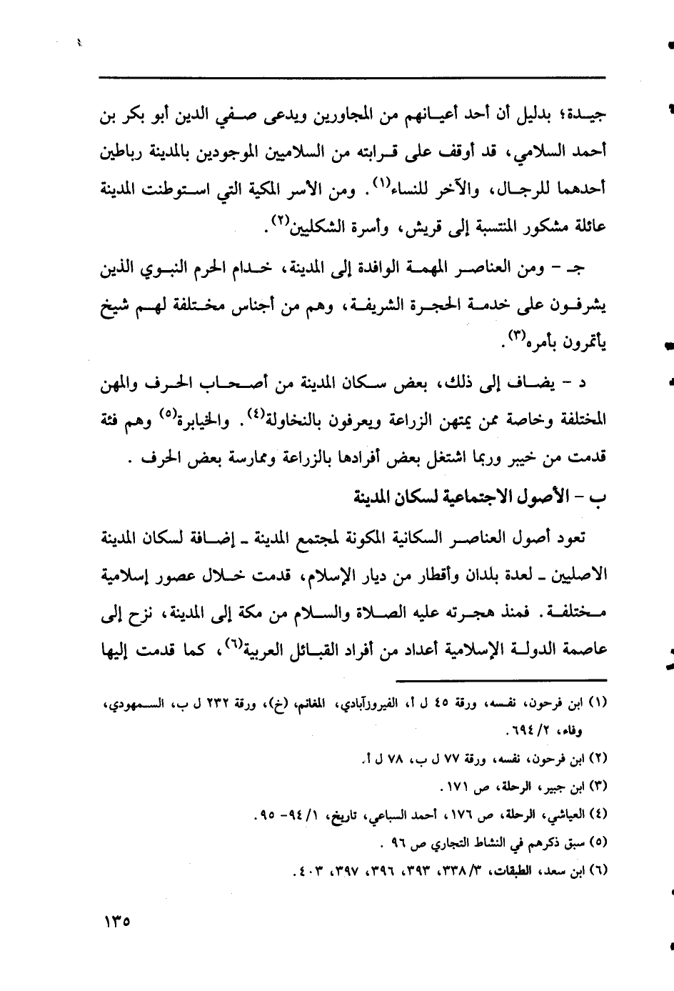 د- يضاف إلى ذلك، بعض سكان المدينة من أصحاب الحرف والمهن المختلفة وخاصة ممن يمتهن الزراعة ويعرفون بالنخاولة (4). والخيابرة (5) وهم فئة قدمت من خيبر وربما اشتغل بعض أفرادها بالزراعة وممارسة بعض الحرف.
