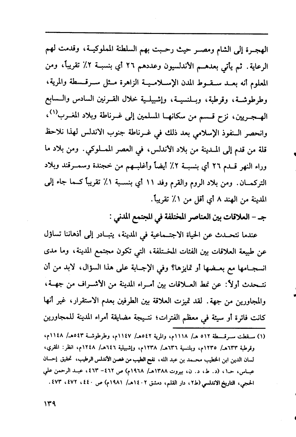 الهجرة إلى الشام ومصر حيث رحبت بهم السلطنة المملوكية، وقدمت لهم الرعاية. ثم يأتي بعدهم الأندلسيون وعددهم 26 أي نسبة 2/ تقريباً، ومن المعلوم أنه بعد سقوط المدن الإسلامية الزاهرة مثل سرقسطة والمرية، وطرطوشة، وقرطبة، وبلنسية، وإشبيلية خلال القرنين السادس والسابع الهجريين، نزح قسم من سكانها المسلمين إلى غرناطة وبلاد المغرب (1)، وانحصر النفوذ الإسلامي بعد ذلك في غرناطة وبلاد المغرب (1)، وانحصر النفوذ الإسلامي بعد ذلك في غرناطة جنوب الاندلس لهذا نلاحظ قلة من قدم إلى المدنية من بلاد الأندلس، في العصر المملوكي. ومن بلاد ما وراء النهر قدم 26 أي بنسبة 2% أيضاً وأغلبهم من خجندة وسمرقند وبلاد التركمان. ومن بلاد الروم والقرم وفد 11 أي بنسبة 1/ تقريباً كما جاء إلى المدينة من الهند 8 أي أقل من 1% تقريباً.