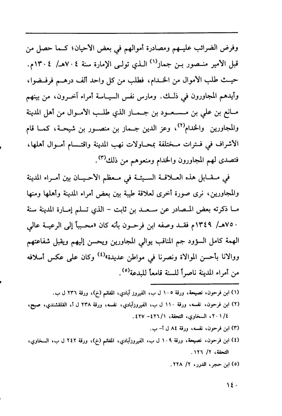 وفرض الضرائب عليهم ومصادرة أموالهم في بعض الأحيان؛ كما حصل من قبل الأمير منصور بن جماز (1) الذي تولى الإمارة سنة 704هـ/ 1304م. حيث طلب الأموال من الخدام، فطلب من كل واحد ألف درهم فرفضوا، وأيدهم المجاورون في ذلك. ومارس نفس السياسة أمراء آخرون، من بينهم مانع بن علي بن مسعود بن جماز الذي طلب الأموال من أهل المدينة والمجاورين والخدام (2)، وعز الدين جماز بن منصور بن شيحة، كما قام الأشراف في فترات مختلفة بمحاولات نهب المدينة واقتسام أموال أهلها، فتصدى لهم المجاورون والخدام ومنعوهم من ذلك (3).