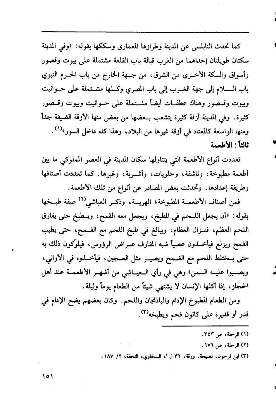 كما تحدث النابلسي عن المدينة وطرازها المعماري وسككها بقوله: "وفي المدينة سكتان طويلتان إحداهما من المغرب قبالة باب القلعة مشتملة على بيوت وقصور وأسواق والسكة الأخرى من الشرق، من من جهة الخارج من باب الحرم النبوي باب السلام إلى جهة الغرب إلى باب المصري وكلها مشتملة على حوانيت وبيوت وقصور كثيرة. وفي المدينة أزقة كثيرة يتشعب بعضها من بعض منها الأزقة الضيقة جداً ومنها الواسعة كالمعتاد في أزقة غيرها من البلاد، وهذا كله داخل السور" (1).