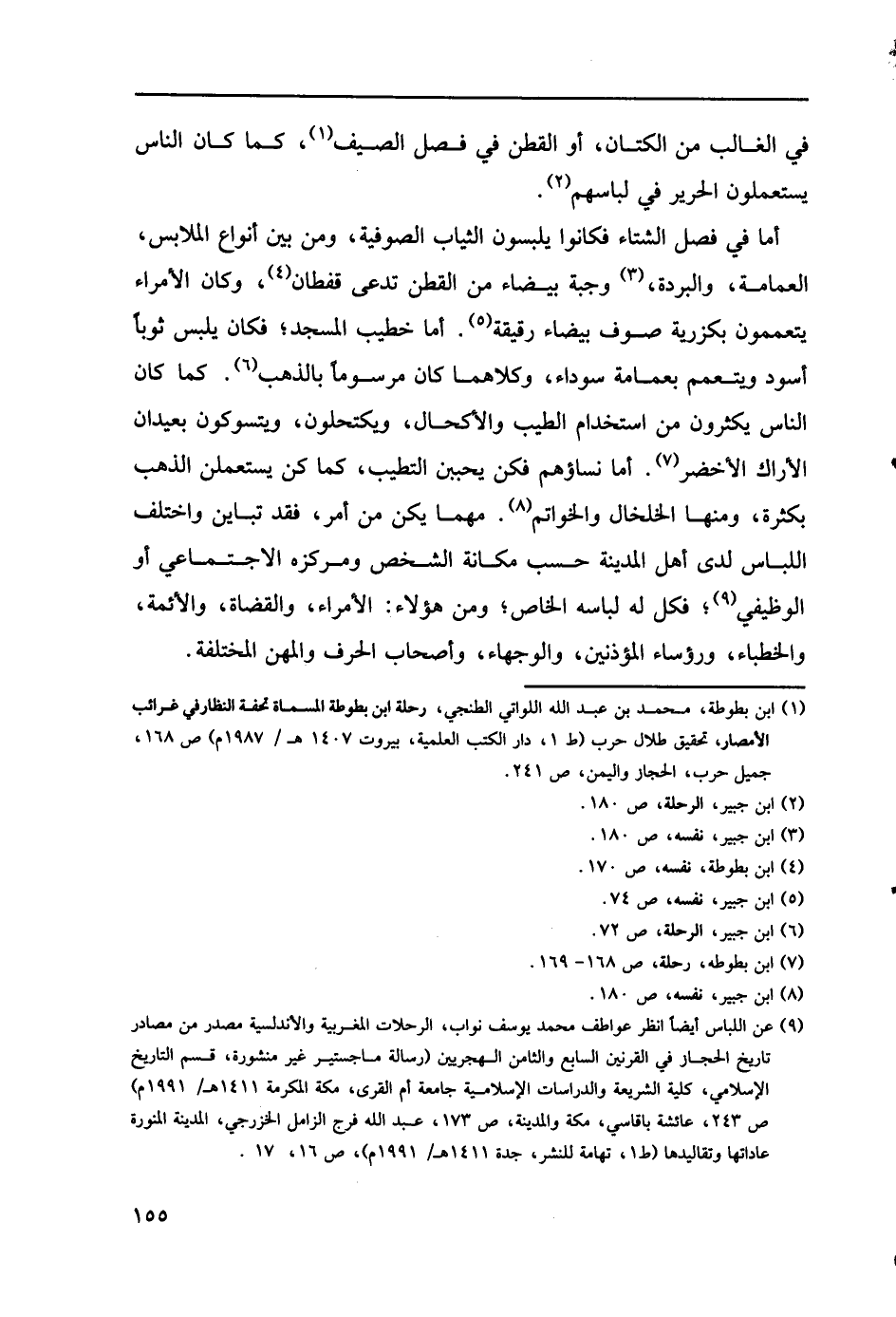 (9) عن اللباس أيضاً انظر عواطف محمد يوسف نواب، الرحلات المغربية والأندلسية مصدر من مصادر تاريخ الحجاز في القرنين السابع والثامن الهجريين (رسالة ماجستير غير منشورة، قسم التاريخ الإسلامي، كلية الشريعة والدراسات الإسلامية جامعة أم القرى، مكة المكرمة 1411هـ/1991م) ص 243، عائشة باقاسي، مكة والمدينة، ص 173، عبد الله فرج الزامل الخزرجي، المدينة المنورة عاداتها وتقاليدها (ط1، تهامة للنشر، جدة 1411هـ/ 1991م)، ص 16، 17.