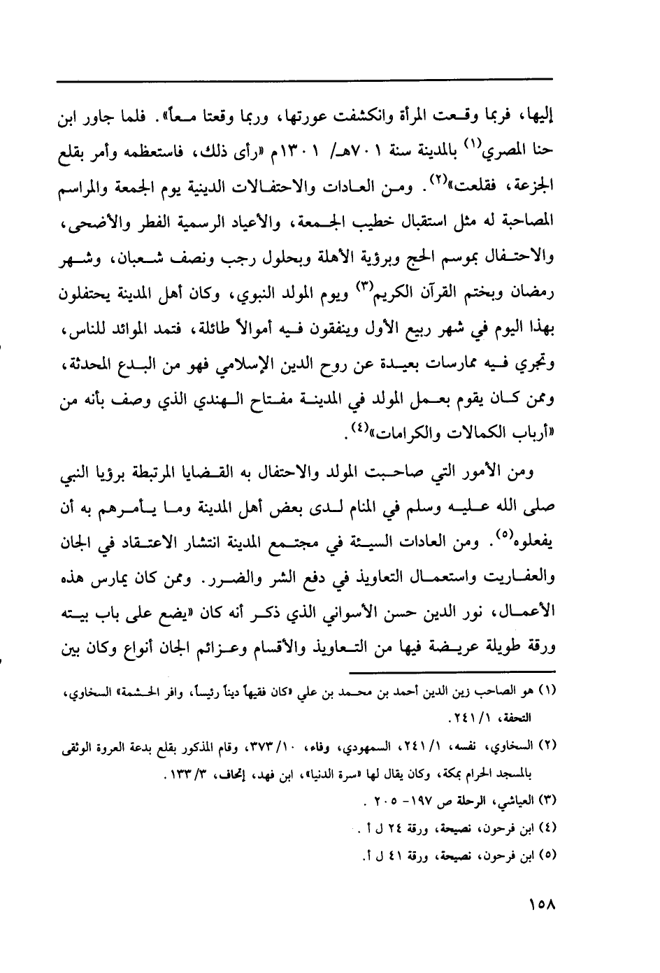 إليها، فربما وقعت المرأة وانكشفت عورتها، وربما وقعتا معاً ". فلما جاور ابن حنا المصري (1) بالمدينة سنة 701هـ/1301م" رأى ذلك، فاستعظمه وأمر بقلع الجزعة، فقلعت " (2). ومن العادات والاحتفالات الدينية يوم الجمعة والمراسم المصاحبة له مثل استقبال خطيب الجمعة، والأعياد الرسمية الفطر والأضحى، والاحتفال بموسم الحج وبرؤية الأهلة وبحلول رجب ونصف شعبان، وشهر رمضان وبختم القرآن الكريم (3) ويوم المولد النبوي، وكان أهل المدينة يحتفلون بهذا اليوم في شهر ربيع الأول وينفقون فيه أموالا طائلة، فتمد الموائد للناس، وتجري فيه ممارسات بعيدة عن روح الدين الإسلامي فهو من البدع المحدثة، وممن كان يقوم بعمل المولد في المدينة مفتاح الهندي الذي وصف بأنه من "أرباب الكمالات والكرامات" (4).