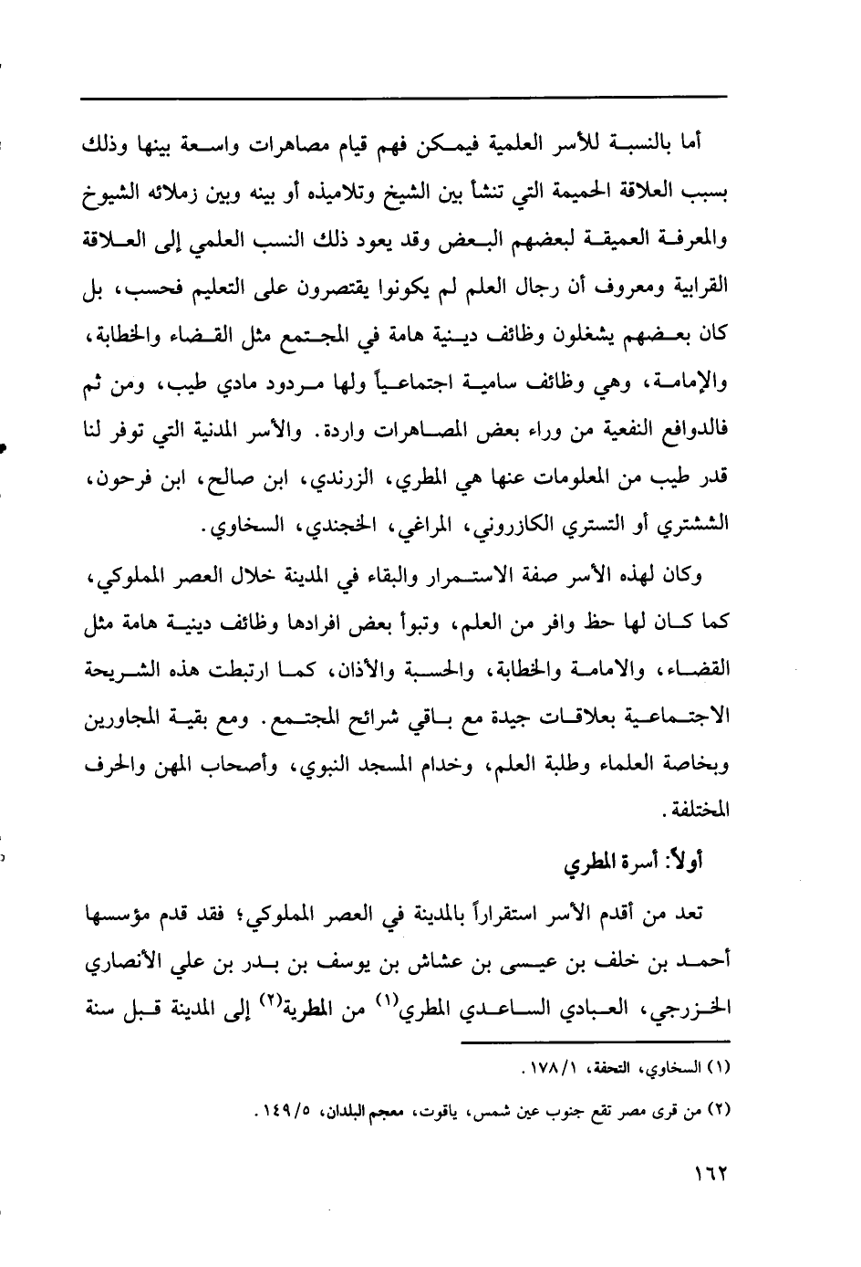 وكان لهذه الاسر صفة الاستمرار والبقاء في المدينة خلال العصر المملوكي، كما كان لها حظ وافر من العلم، وتبوأ بعض افرادها وظائف دينية هامة مثل القضاء، والامامة والخطابة، والحسبة والآذان، كما ارتبطت هذه الشريحة الاجتماعية بعلاقات جيدة مع باقي شرائح المجتمع. ومع بقية المجاورين وبخاصة العلماء وطلبة العلم، وخدام المسجد النبوي، وأصحاب المهن والحرف المختلفة.