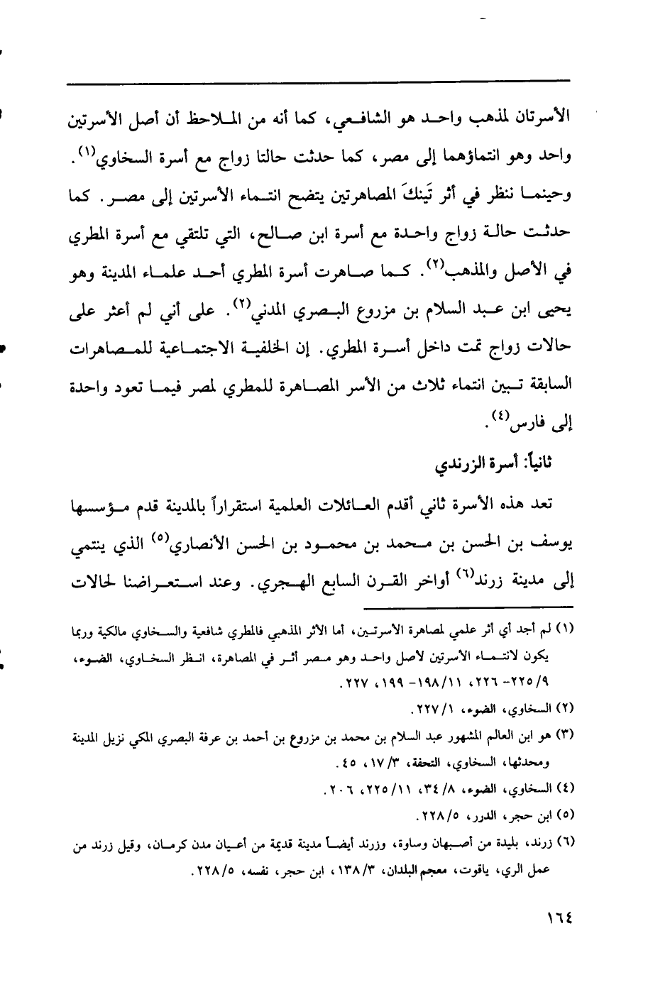 (1) لم أجد أي أثر علمي لمصاهرة الأسرتين، أما الأثر المذهبي فالمطري شافعية والسخاوي مالكية وربما يكون لانتماء الأسرتين لاصل واحد وهو مصر أثر في المصاهرة، انظر السخاوي، الضوء، 225/ 9 - 226،198/ 11 - 199،227.