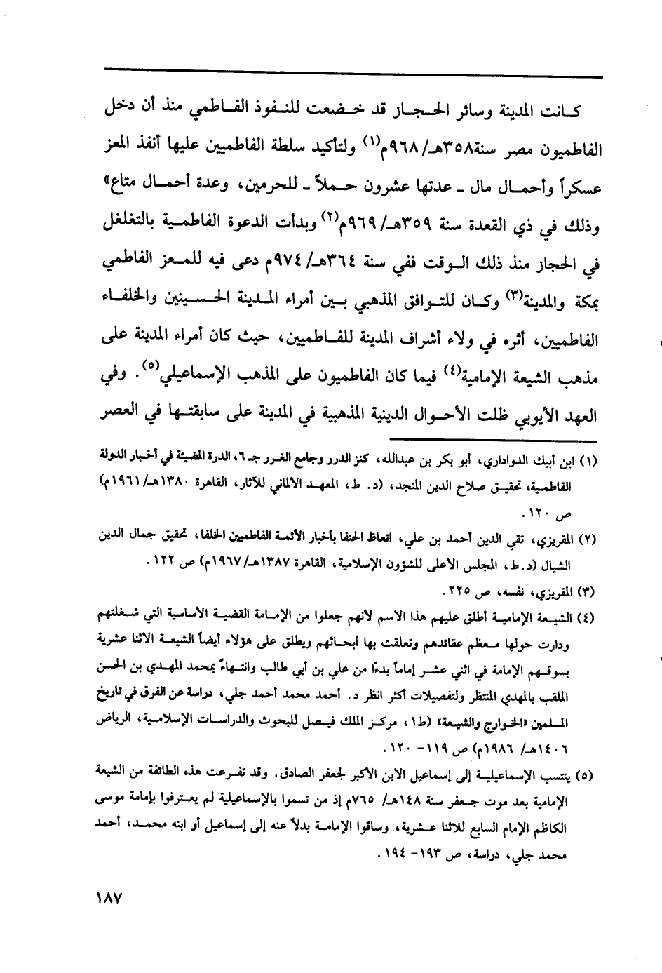 (5) ينتسب الإسماعيلية إلى إسماعيل الابن الأكبر لجعفر الصادق. وقد تفرعت هذه الطائفة من الشيعة الإمامية بعد موت جعفر سنة 148هـ/ 765م إذ من تسموا بالإسماعيلية لم يعترفوا بإمامة موسى الكاظم الإمام السابع للاثنا عشرية، وساقوا الإمامية بدلاً عنه إلى إسماعيل أو ابنه محمد، أحمد محمد جلي، دراسة، ص 193 - 194.