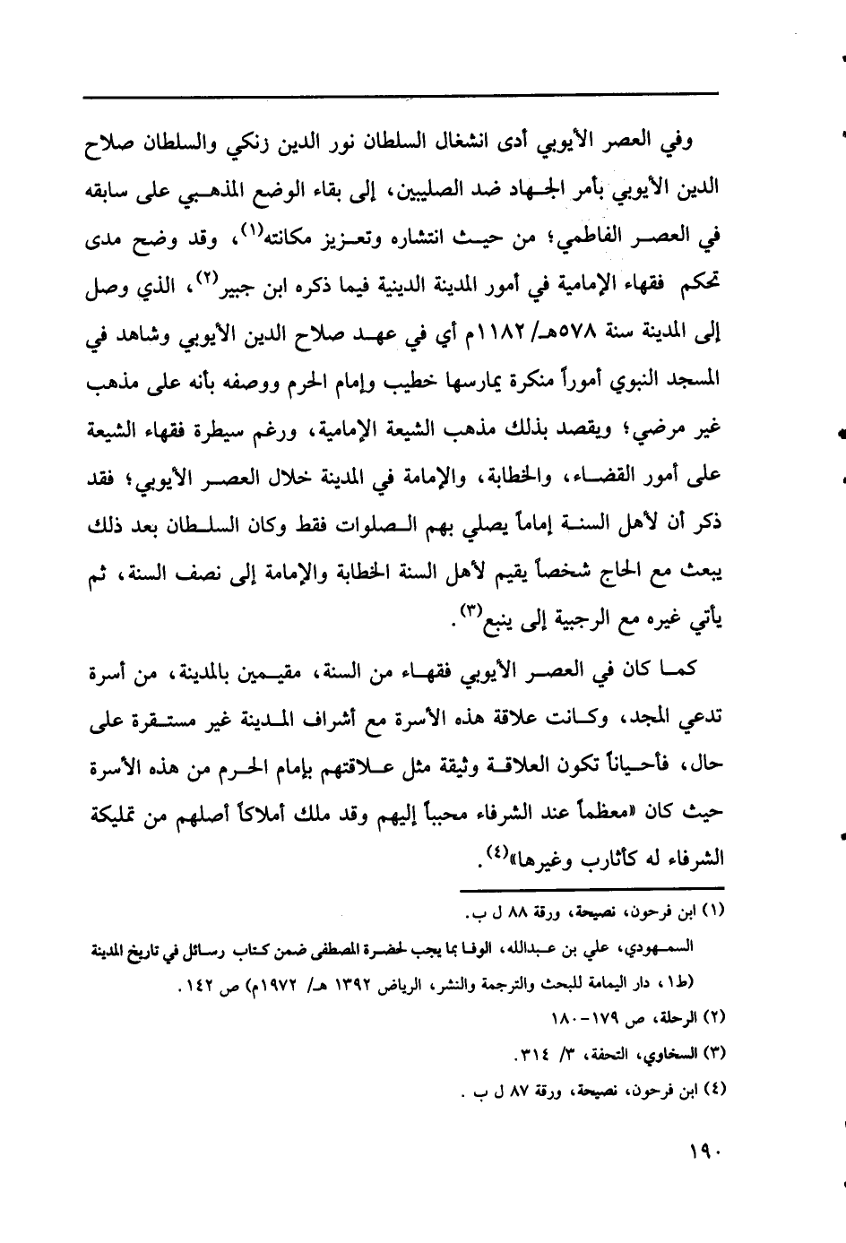 (1) ابن فرحون، نصيحة، ورقة 88 ل ب. السمهودي، علي بن عبد الله، الوفا بما يجب لحضرة المصطفى ضمن كتاب رسائل في تاريخ المدينة (ط1، دار اليمامة للبحث والترجمة والنشر، الرياض 1392هـ/ 1972م) ص 142.