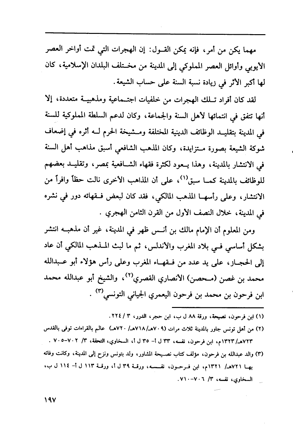 (3) والد عبد الله بن فرحون، مؤلف كتاب نصيحة المشاور، ولد بتونس ونزح إلى المدينة، كانت وفاته بها 721هـ/ 1321م، ابن فرحون، نفسه، ورقة 39ل أ، ورقة 113 ل أ - 114 ل ب، السخاوي، نفسه، 3/ 706 - 710.