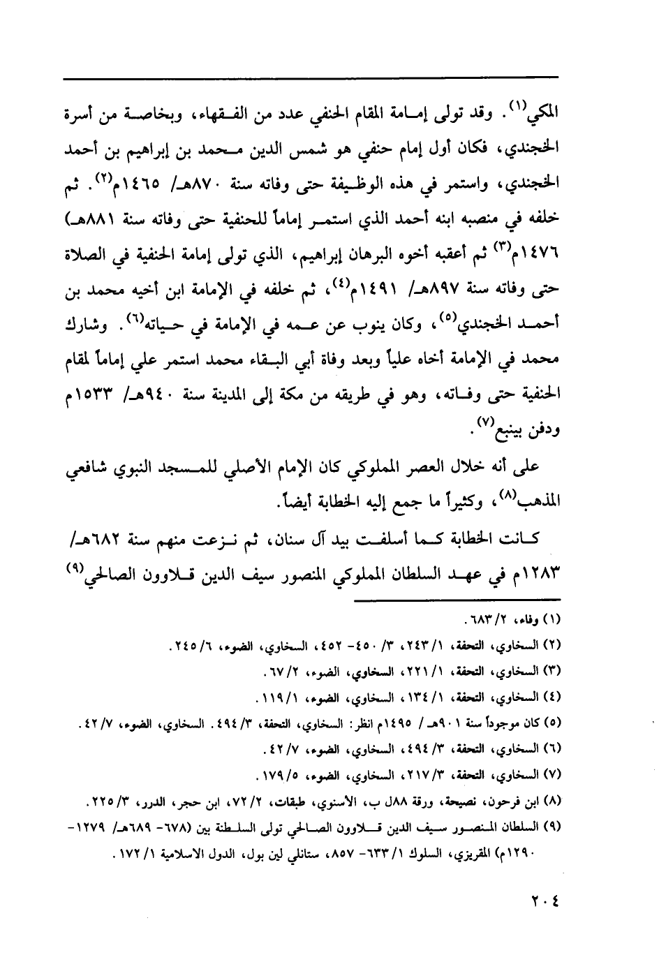 المكي (1). وقد تولى إمامة المقام الحنفي عدد من الفقهاء، وبخاصة من أسرة الخجندي، فكان أول إمام حنفي هو شمس الدين محمد بن إبراهيم بن أحمد الخجندي، واستمر في هذه الوظيفة حتى وفاته سنة 870هـ/ 1465م (2). ثم خلفه في منصبه ابنه أحمد الذي استمر إماماً للحنفية حتى وفاته سنة 881هـ) 1476م (3) ثم أعقبه أخوه البرهان إبراهيم، الذي تولى إمامة الحنفية في الصلاة حتى وفاته سنة897هـ/ 1419م (4)، ثم خلفه في الإمامة ابن أخيه محمد بن أحمد الخجندي (5)، وكان ينوب عن عمه في الإمامة في حياته (6). وشارك محمد في الإمامة أخاه علياً وبعد وفاة أبي البقاء محمد استمر علي إماماُ لمقام الحنفية حتى وفاته، وهو في طريقه من مكة إلى المدينة سنة 940هـ/ 1533م ودفن بينبع (7).