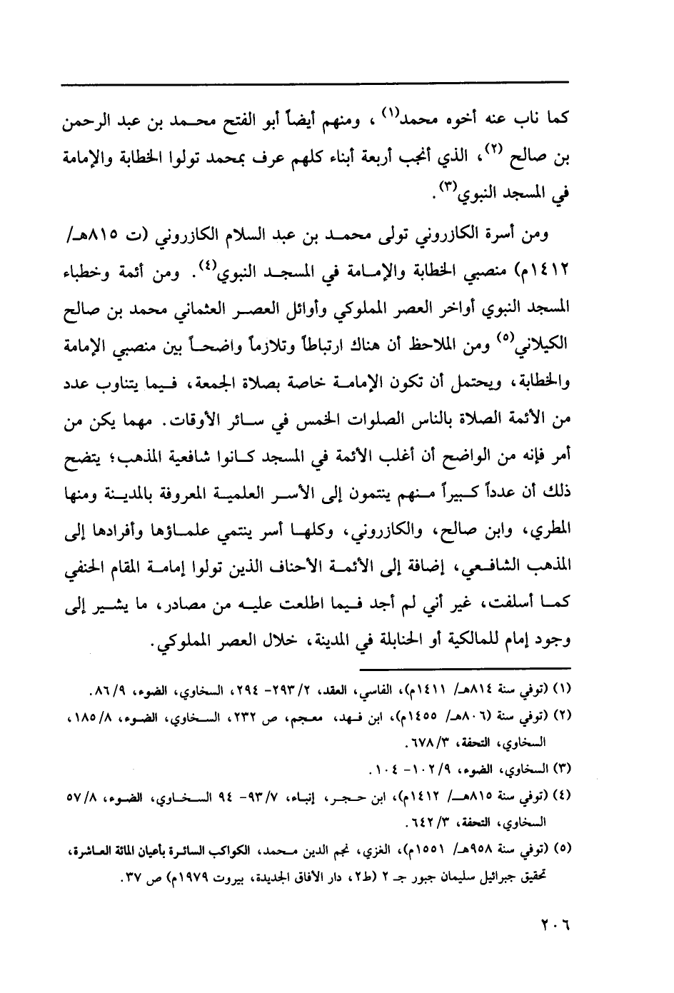 ومن أسرة الكازروني تولى محمد بن عبد السلام الكازروني (ت 815هـ/ 1412م) منصبي الخطابة والإمامة في المسجد النبوي (4). ومن أئمة وخطباء المسجد النبوي أواخر العصر المملوكي وأوائل العصر العثماني محمد بن صالح الكيلاني (5) ومن الملاحظ أن هناك ارتباطاً وتلازماً واضحاً بين منصبي الإمامة والخطابة، ويحتمل أن تكون الإمامة خاصة بصلاة الجمعة، فيما يتناوب عدد من الأئمة في المسجد كانوا شافعية المذهب؛ يتضح لك أن عدداً كبيراً منهم ينتمون إلى الأسر العلمية المعروفة بالمدينة ومنها المطري، وابن صالح، والكازروني، وكلها أسر ينتمي علماؤها وأفرادها إلى المذهب الشافعي، إضافة إلى الأئمة الأحناف الذين تولوا إمامة المقام الحنفي كما أسلفت، غير أني لم أجد فيما اطلعت عليه من مصادر، ما يشير إلى وجود إمام للمالكية أو الحنابلة في المدينة، خلال العصر المملوكي.