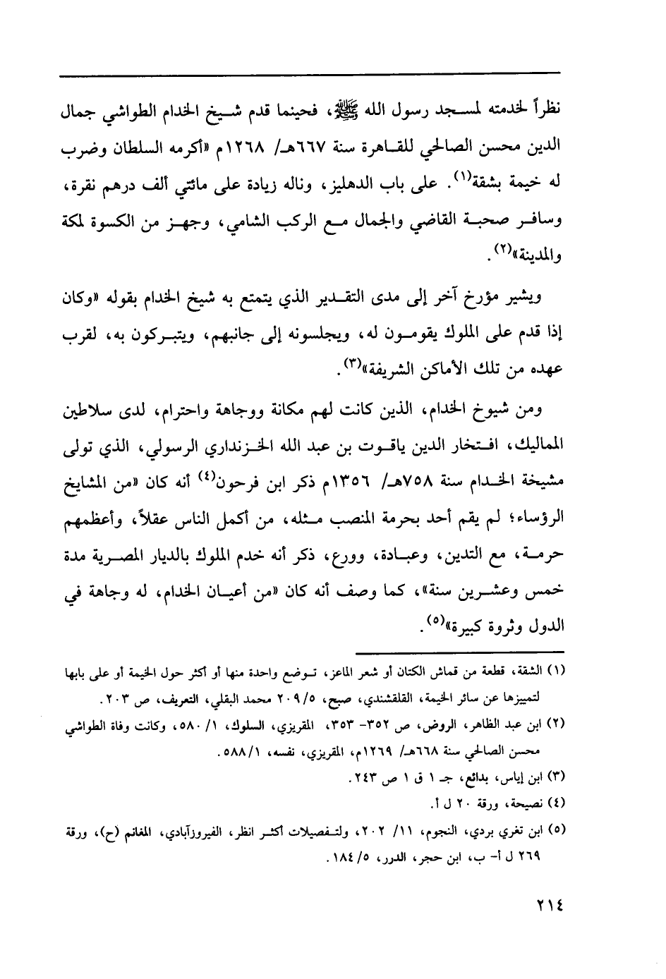 ويشير مؤرخ آخر إلى مدى التقدير الذي يتمتع به شيخ الخدام بقوله "وكان إذا قدم على الملوك يقومون له ويجلسون إلى جانبهم، ويتبركون به، لقرب عهده من تلك الأماكن الشريفة" (3).