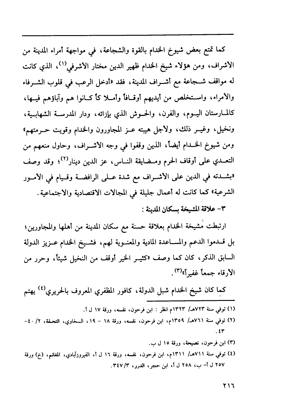 كما تمتع بعض شيوخ الخدام بالقوة والشجاعة، في مواجهة أمراء المدينة من الأشراف، ومن هؤلاء شيخ الخدام ظهير الدين مختار الأشرفي (1)، الذي كانت له مواقف شجاعة مع أشراف المدينة، فقد "أدخل الرعب في قلوب الشرفاء والأمراء، واستخلص من أيديهم أوقافا وأملاكاً كانوا هم وآباؤهم فيها كالمارستان اليوم، والفرن، والحوش الذي بإزائه، ودار المدرسة الشهابية، ونخيل، وغير ذلك، ولأجل هيبته عز المجاورون والخدام وقويت حرمتهم " ومن شيوخ الخدام أيضاً، الذين وقفوا في وجه الأشراف، وحاول منعهم التعدي على أوقاف الحرم ومضايقة الناس، عز الدين دينار (2) وقد وصف "بشدته في الدين على الأشراغ مع شدة على الرافضة وقيام في الأمور الشرعية" كما كانت له أعمال جليلة في المجالات الاقتصادية والاجتماعية.