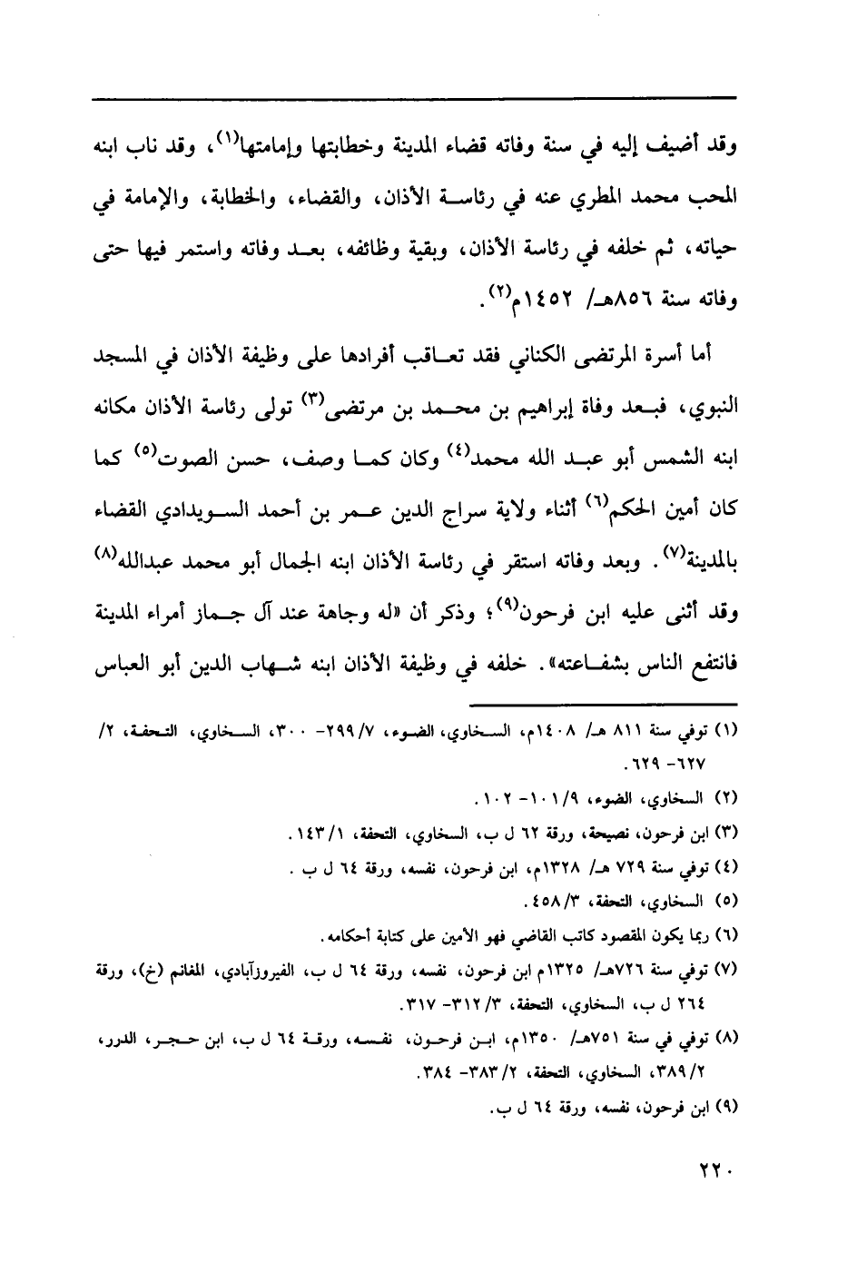 أما أسرة المرتضى الكناني فقد تعاقب أفرادها على وظيفة الأذان في المسجد النبوي، فبعد وفاة إبراهيم بن محمد بن مرتضى (3) تولى رئاسة الأذان مكانه ابنه الشمس أبو عبدالله محمد (4) وكان كما وصف، حسن الصوت (5) كما كان أمين الحكم (6) اثناء والية سراج الدين عمر بن أحمد السويدادي القضاء بالمدينة (7). وبعد وفاته استقر في رئاسة الأذان ابنه الجمال أبو محمد عبد الله (8) وقد أثنىعليه ابن فرحون (9)؛ وذكر أن "له وجاهة عند آل جماز أمراء المدينة فانتفع الناس بشفاعته ". خلفه في وظيفة الأذان ابنه شهاب الدين أبو العباس