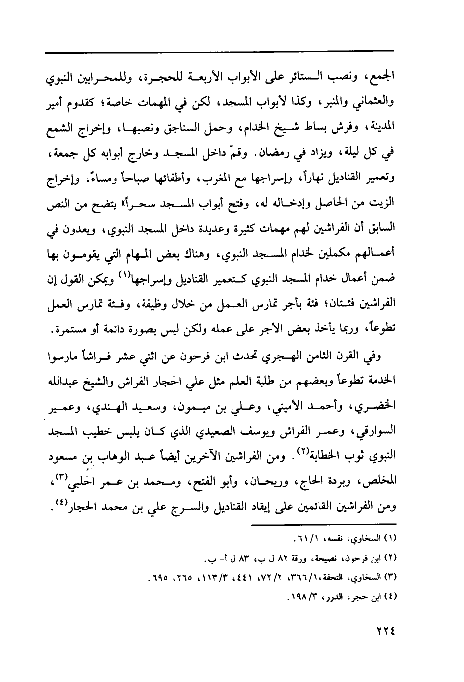 الجمع، ونصب الستائر على الأبواب الأربعة للحجرة، وللمحرابين النبوي العثماني والمنبر، وكذا لأبواب المسجد، لكن في المهمات خاصة؛ كقدوم أمير المدينة، وفرش بساط شيخ الخدام، وحمل السناجق ونصبها، وإخراج الشمع في كل ليلة، ويزاد في رمضان. وقمّ داخل المسجد وخارج أبوابه كل جمعة، وتعمير القناديل نهاراً، وإسراجها مع المغرب، وأطفائها صباحاً ومساءً، وإخراج الزيت من الحاصل وإداخاله له، وفتح أبواب المسجد سحراً" يتضح من النص السابق أن الفراشين لهم مهمات كثيرة وعديدة داخل المسجد النبوي، ويعدون في أعمالهم مكملين لخدام المسجد النبوي كتعمير القناديل وإسراجها (1) ويمكن القول إن الفراشين فئتان؛ فئة بأجر تمارس العمل من خلال وظيفة، وفئة تمارس العمل تطوعاً، وربما يأخذ بعض الأجر على عمله ولكن ليس بصورة دائمة أو مستمرة.