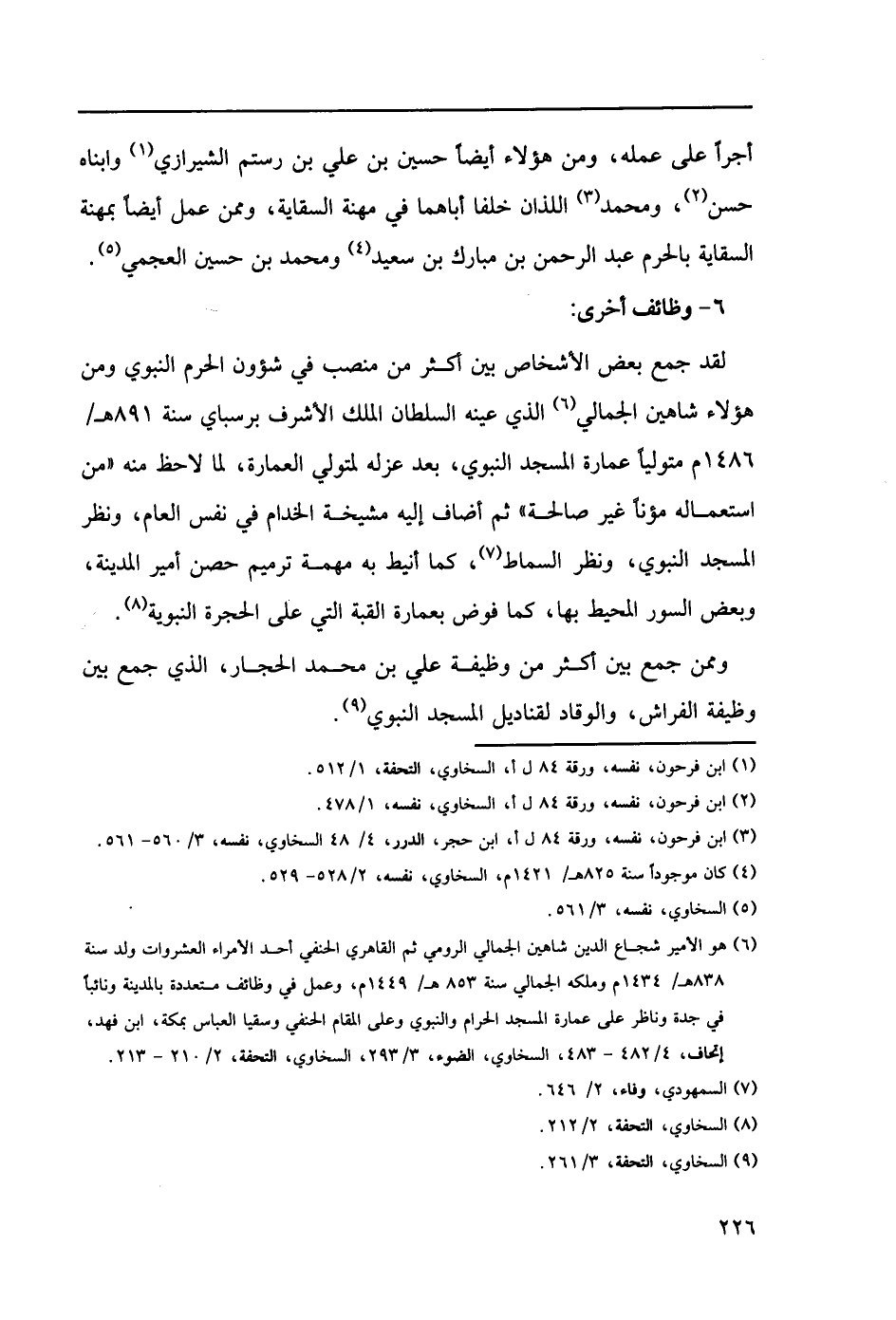 (6) هو الأمير شجاع الدين شاهين الجمالي الرومي ثم القاهري الحنفي أحد الأمراء العشروات ولد سنة 838هـ/1434م، وعمل في وظائف متعدده بالمدينة ونائباً في جدة وناظر على عمارة المسجد الحرام والنبوي وعلى المقام الحنفي وسيقا العباس بمكة، ابن فهد، إتحاف، 4/ 482 - 483، السخاوي، الضوء، 3/ 293، السخاوي، التحفة، 2/ 210 - 213.