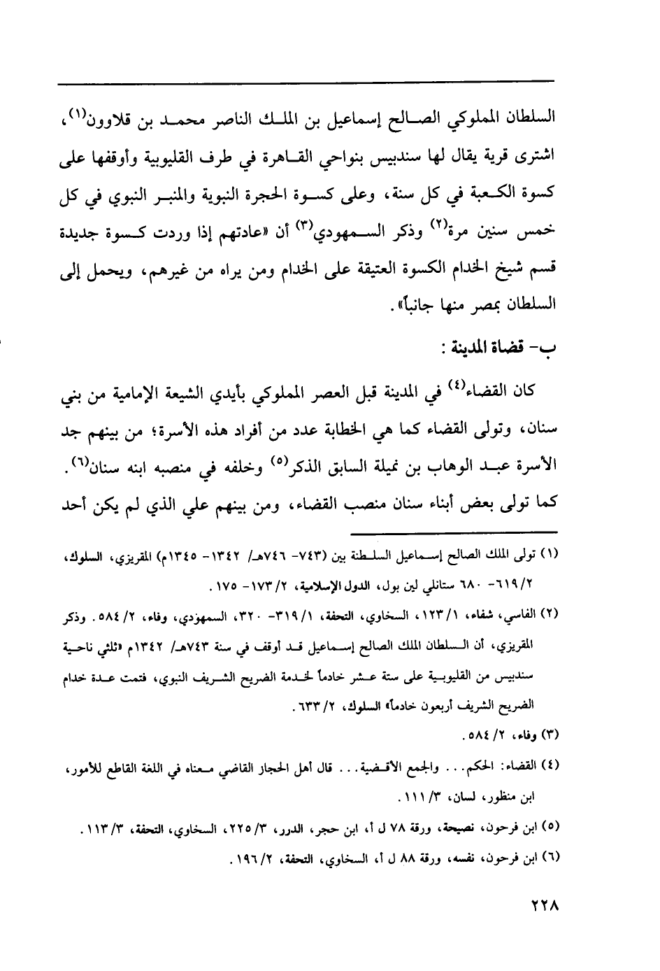 (2) الفاسي، شفاء، 1/ 123، السخاوي، التحفة، 1/ 319 - 320، السمهودي، وفاء 2/ 584. وذكر المقريزي، أن السلطان الملك الصالح إسماعيل قد أوقف في سنة 743هـ/ 1342م " ثلثي ناحية سندبيس من القليوبية على ستة عشر خادماً لخدمة الضريح الشريف النبوي، فتمت عدة خدام الضريح الشريف أربعون خادماً " السلوك، 2/ 633.