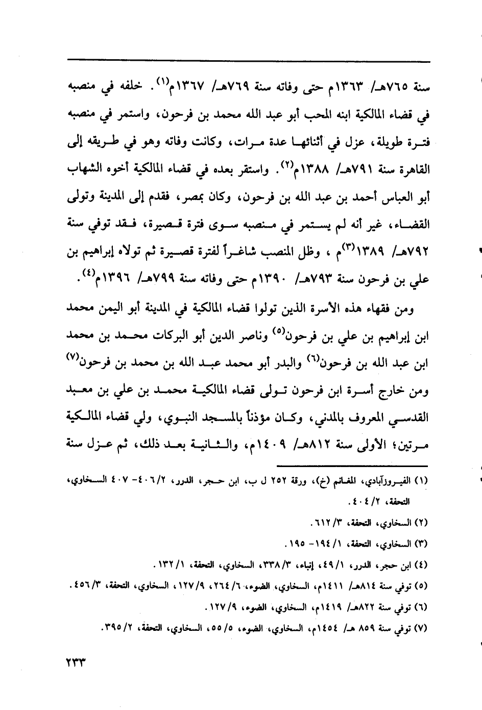 سنة 765هـ/ 1363م حتى وفاته سنة 769هـ/1367م (1). خلفه في منصبه في قضاء المالكية ابنه المحب أبو عبد الله محمد بن فرحون، واستمر في منصبه فترة طويلة، عزل في أثنائها عدة مرات، وكانت وفاته وهو في طريفه إلى القاهرة سنة 791هـ/ 1388م (2). واستقر بعده في قضاء المالكية أخوه الشهاب أبو العباس أحمد بن عبد الله بن فرحون، وكان بمصر، فقد إلى المدينة وتولى القضاء، غير أنه لم يستمر في منصبه سوى فترة قصيرة، فقد توفي سنة 792هـ/ 1389م (3)، وظل المنصب شاغراً لفترة قصيرة ثم تولاه إبراهيم بن علي بن فرحون سنة 793هـ/ 1390م حتى وفاته سنة 799هـ/ 1396م (4).