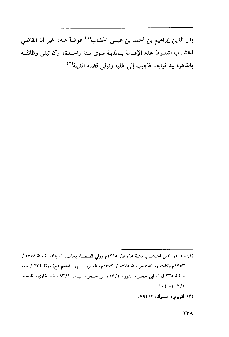 (1) ولد بدر الدين الخشاب سنة 698هـ/1298م وولي القضاء بحلب، ثم بالمدينة سنة 754هـ/1353م وكانت وفاته بمصر سنة 775هـ/1373م، الفيرزآبادي، المغانم (خ) ورقة 234 ل ب، ورقة 235ل أ، ابن حجر، الدرر، 13/ 1، ابن حجر، إنباء، 83/ 1، السخاوي، نفسه، 102/ 1 - 104.