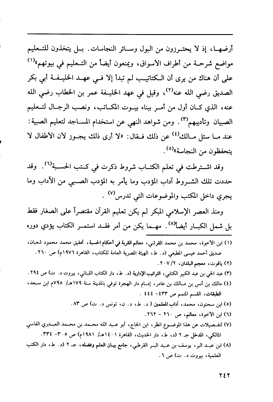 أرضها، إذ لا يحترزون من البول وسائ النجاسات. بل يتخذون للتعليم موضع شرحة من أطراف الأسواق، ويمنعون أيضاً من التعليم في بيوتهم " (1) على أن هناك من يرى أن الكتاتيب لم تبدأ إلا في عهد الخليفة أبي بك رالصديق رضي الله عنه (2)،وقيل في عهد الخليفة عمر بن الخطاب رضي الله عنه، الذي كان أول من أمر ببناء بيوت المكاتب، ونصب الرجال لتعليم الصبيان وتأديبهم (3). ومن شواهد النهي عن استخدام المساجد لتعليم الصبية: عندما سئل مالك (4) عن ذلك فقال: " لا أرى ذلك يحوز لأن الأطفال لا يتحفظن من النجاسة " (5).