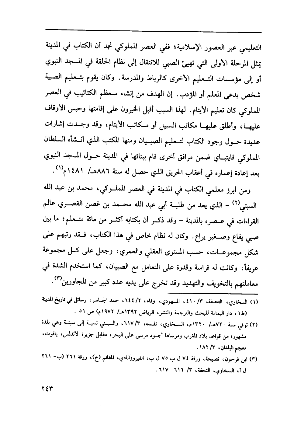 التعليمي عبر العصور الإسلامية؛ ففي العصر المملوكي نجد أن الكتاب في المدينة يمثل المرحلة الأولى التي تخيئ الصبي للانتقال إل نظام الحلقة في المسجد النبوي أو إلى مؤسسات التعليم الأخرى كالرباط والمدرسة. وكان يقوم بتعليم الصبية شخص يدعى المعلم أو المؤدب. إن الهدف من إنشاء معظم الكتاتيب في العصر المملوكي كان تعليم الأيتام. لهذا السبب أقل الخيرون على إقامتها وحبس الأوقاف عليها، وأطلق عليها مكاتب السبيل أو كاتب الأيتام، وقد وجدت إشارات عديدة حول وجود الكتاب لتعليم الصبيان ومنها المكتب الذي أنشأه السلكان المملوكي قايتباي ضمن مرافق أخرى قام ببنائها في المدينة حول المسجد النبوي بعد إعادة إعماره في أعقاب الحريق الذي حصل له سنة 886هـ/1481م (1).