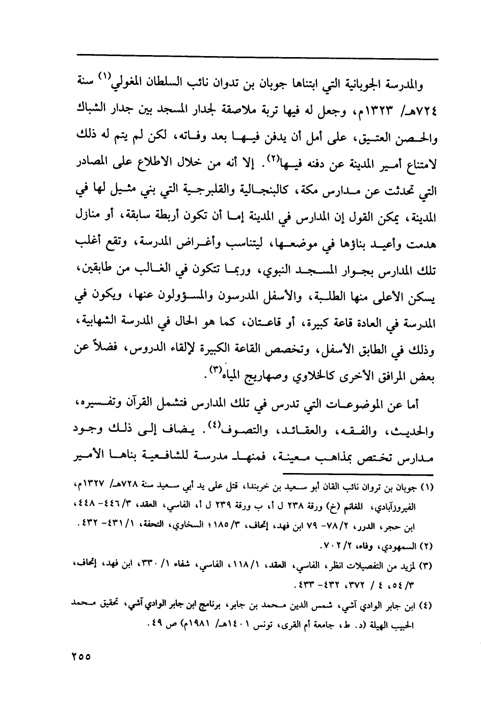 والمدرسة الجوبانية التي اتناها جوبان بن تدوان نائب السلطان المفولي (1) سنة 724هـ/1323م، وجعل له فيها تربة ملاصقة لجدار المسجد بين جدار الشباك والحصنالعتيق، على أمل أن يدفن فيها بعد وفاته، لكن لم يتم له ذلك لأمتناع أمير المدينة عن دفنه فيها (2). إل أنه من خلال الاطلاع على المصادر التي تحدثت عن مجارس مكة، كالبنجالية والقلبرجية التي بنى مثيل لها في المدينة، يمكن القول إن المدراس في المدينة إما أن تكون أربطة سابقة، أو منازل هدمت وأعيد يناؤها في موضعها، ليتناسب وأغراض المدرسة، وتقع اغلب تلك المدارس بجوارالمسجد النبوي، وربما تتكون في الغالب من طابقين، يسكن الأعلى منها الطلبة، والأسفل المدرسون والمسؤولون عنها، ويكون في المدرسة في العدة قاعة كبيرة، أو قاعتان، كما هو الحال في المدرسة الشهابية، وذلك في الطابق الأسفل، وتخصص القاعة الكبيرة لإلقاء الدروس، فضلاً عن بعض المرافق الأخرى كالخلاوي وصهاريج المياه (3).