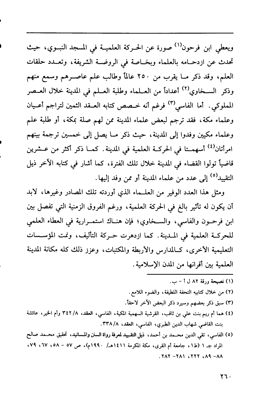 ويعطي ابن فرحون (1) صورة عن الحركة العلمية في المسجد النبوي، حيثس تحدث عن ازدحامه بالعلماء وبخاصة في الروضة الشريفة، وتعدد حلقات العلم، وقد ذكر ما يقرب من 250 عالماًوطالب علم عاصرهم وسمع منهم وذكر السخاوي (2) أعداداًمن العلماء وطلبة اللعلم في المدينة خلال العشصر المملوكي. أما الفاسي (3) فرغم أنه خصص كتابه العقد الثمين لتراجم أعيان وعلماماء مكة، فقد ترجم لبعض علماء المدينة ممن لهم صلة بمكة، أو طلبة علم وعلماء مكيين وفدوا إلى المدينة، حيث ذكر ما يصل إلى خمسين ترجمة بينهم امرأتان (4) اسهمتا في الحركة العلمية في المدنية. كما ذكر أكثر من عشرين قاضياًتولوا القضاء في المدينة خلال تلك الفترة، كما أشار في كتابه الآخر ذيل التقييد (5) إلى عدد منعلماء المدينة أو ممن وفد إليها.