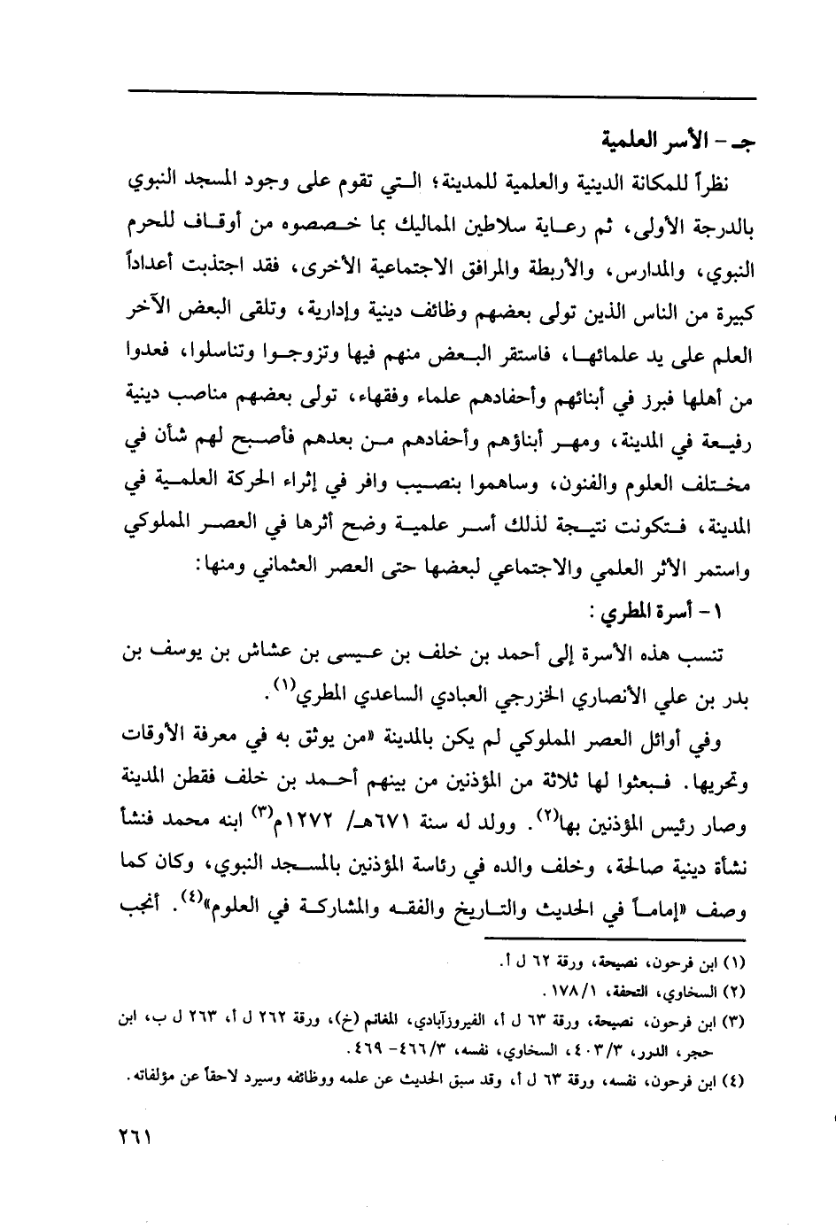 نظراً للمكانة الدينية والعلمية للمدينة؛ التي تقوم على وجود المسجد النبوي بالدرجة الأولى، ثم رعاية سلاطين المماليك بما خصصوه من أوقاف للحرم النبوي، والمدارس، والأربطة والمرافق الاجتماعية الأخرى، فقد اجتذب أعداداً كبيرة من الناس الذين تولى بعضهم وظائف دينية وإدارية، وتلقى البعض الآخر العلم على يد علمائها، فاستقر البعض منهم فيها وتزوجوا وتناسلوا، فعدوا من أهلها فبرز في أبنائهم وأحفادهم علماء وفقهاء، تولى بعضهم مناصب دينية رفيعة في المدينة، ومهر أبناؤهم وأحفادهم علماء وفقهاء، تولى بعضهم مناصب دينية رفيعة في المدينة، ومهر أبناؤهم وأحفادهم من بعدهم فأصبح لهم شأن في مختلف العلوم والفنون، وساهموا بنصيب وافر في إثراء الحركة العلمية في المدينة، فتكونت نتيجة لذلك أسر علمية وضح أثرها في العصر المملوكي واستمر الأثر العلمي والاجتماعي لبعضها حتى العصر العثماني ومنها: