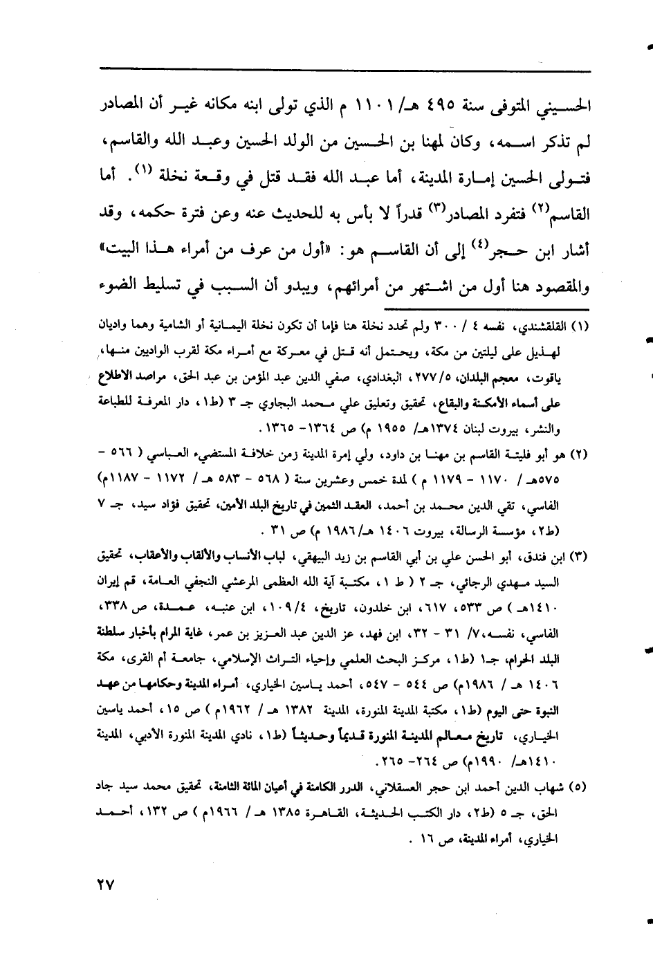 (3) ابن فندق، أبو الحسن علي بن القاسم بن زيد البيهقي، لباب الأنساب والألقاب والأعقاب، تحقيق السيد مهدي الرجائي، جـ2 (ط1، مكتبة آية الله العظمى المرعشي النجفي العامة، قم إيران 1410هـ) ص533، 617، ابن خلدون، تاريخ، 4/ 109، ابن عنبه، عمدة، ص 338، الفاسي، نفسه، 7/ 31 - 32، ابن فهد، عز الدين عبد العزيز بن عمر، غاية المرام بأخبار سلطنة البلد الحرام، جـ1 (ط1، مركز البحث العلمي وإحياء التراث الإسلامي، جامعة أم القرى، مكة 1406هـ/ 1986م) ص 544 - 547، أحمد ياسين الخياري، أمراء المدينة وحكامها من عهد النبوة حتى اليوم (ط1، مكتبة المدينة المنورة، المدينة 1382هـ/ 1962م) ص15، أحمد ياسين لخياري، تاريخ معالم المدينة المنورة قديماً وحديثاً (ط1، نادي المدينة المنورة الأدبي، المدينة 1410هـ/ 1990م) ص 264 - 265.