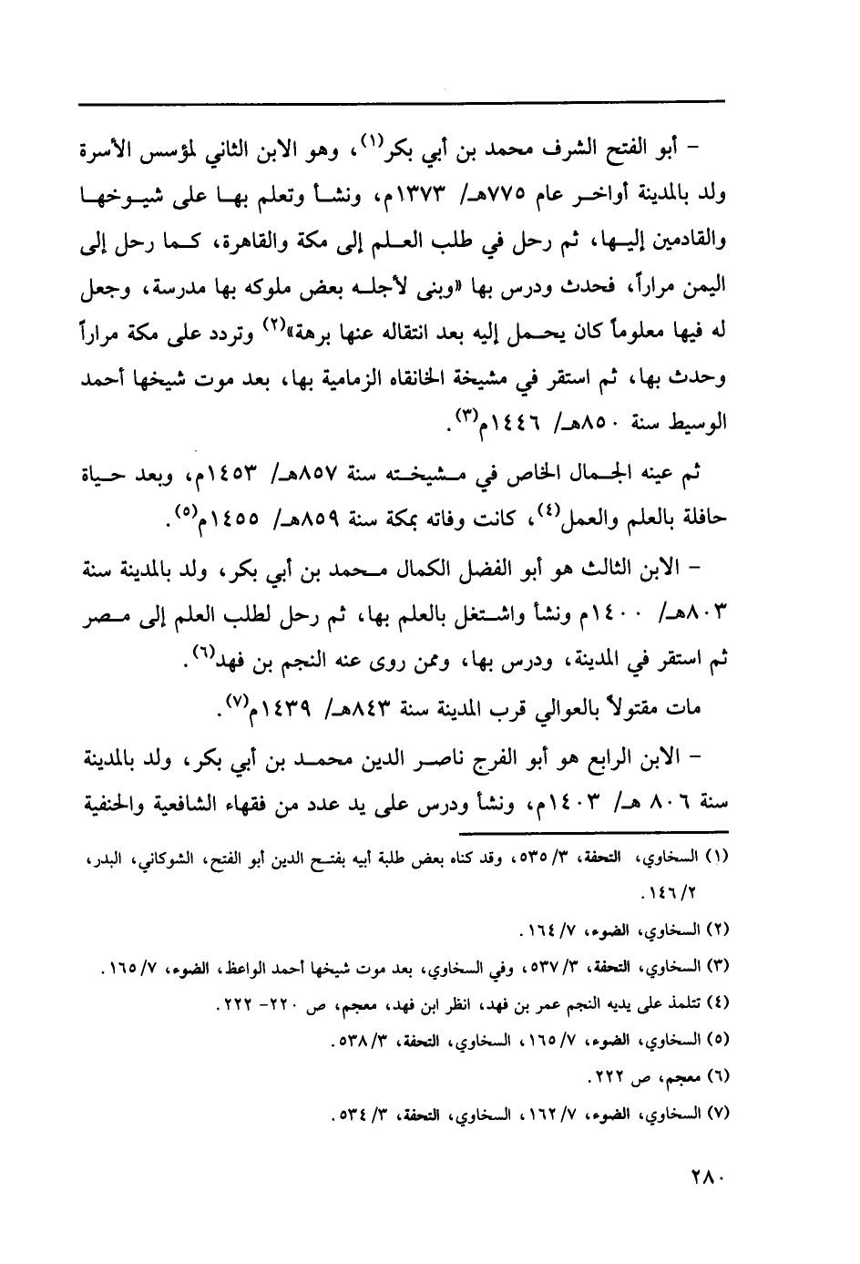 -الابن الرابع هو أبو الفرج ناصر الدين محمد بن أبي بكر، ولد بالمدينة سنة 806هـ/1403م، ونشأ ودرس على يد عدد من فقهاء الشافعية والحنفية