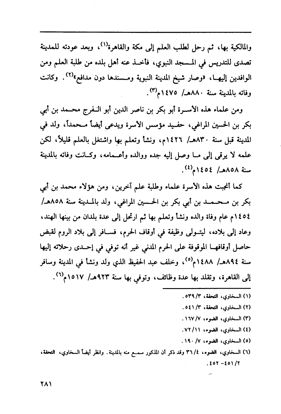 (6) السخاوي، الضوء، 36/ 4 وقد ذكر أن المذكور سمع منه بالمدينة. وانظر أيضاً السخاوي، التحفة، 41/ 2 - 452.