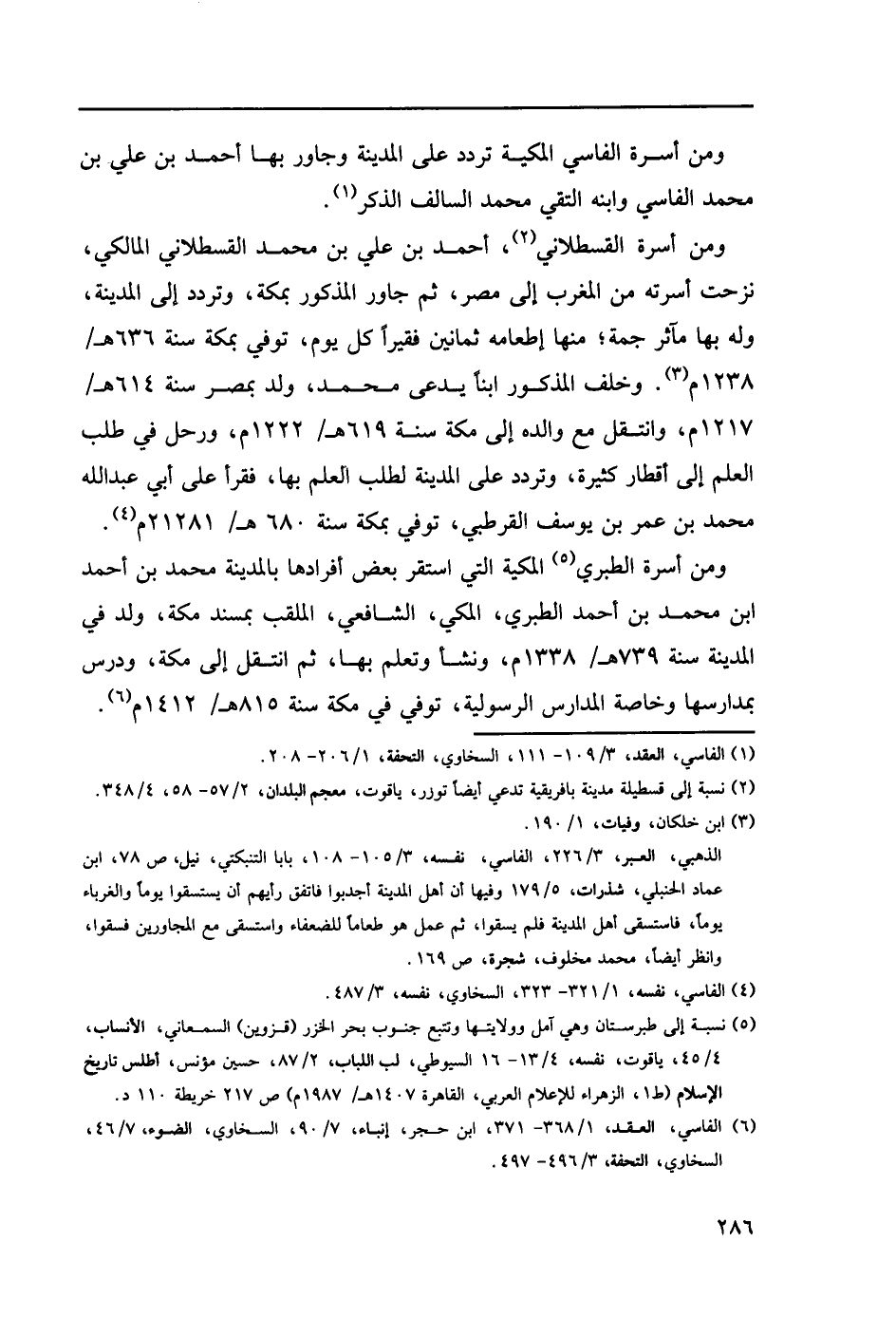 ومن أسرة القسطلاني (2)، أحمد بن علي بن محمد القسطلاني المالكي، نزحت أسرته من المغرب إلى مصرن ثم جاور المذكور بمكة، وتردد إلى المدينة، وله بها مآثر جمة؛ منها إطعامه ثمانين فقيراً كل يوم، توفي بمكة سنة 636هـ/1238/ (3). وخلف المذكور ابناً يدعى محمد، ولد بمصر سنة 614هـ/1217م، وانتقل مع والده إلى مكة سنة 619هـ/1222م، ورحل في طلب العلم إلى أقطار كثيرة، وتردد على المدينة لطلب العلم بها، فقرأ على أبي عبد الله بن محمد بن عمر بن يوسف القرطبي، توفي بمكة سنة 680هـ/21281م (4).
