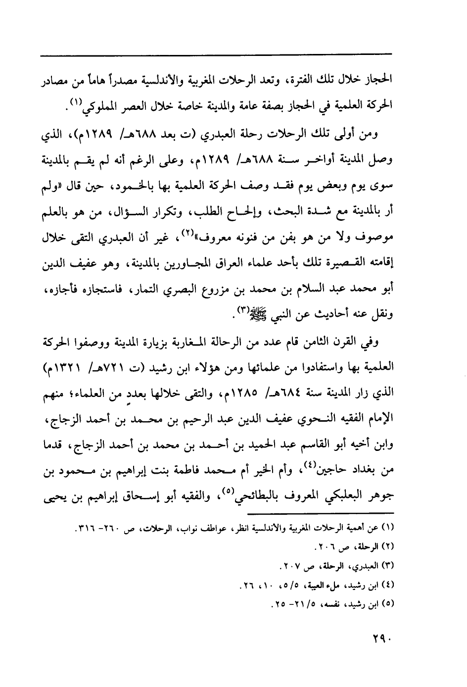 ومن أولى تلك الرحلات رحلة العبدري (ت بعد 688هـ/1298م)، الذي وصل المدينة أواخر سنة 688هـ/1289م، وعلى الرغم أنه لم يقم بالمدينة سوى يوم وبعض يوم فقد وصف الحركة العملية بها بالخمود، حين قال "ولم أر بالمدينة مع شدة البحث، إلحاح الطلب، وتكرار السؤال، من هو بالعلم موصوف ولا من هو بفن من فنونه معروف" (2)، غير أن العبدري التقى خلال إقامته القصيرة تلك بأحد علماء العراق المجاوين بالمدينة، وهو عفيف الدين أبو محمد عبد السلام بن محمد بن مزروع البصري التمار، فاستجازه فأجازه، ونقل عنه أحاديث عن النبي صلى الله عليه وسلم (3).