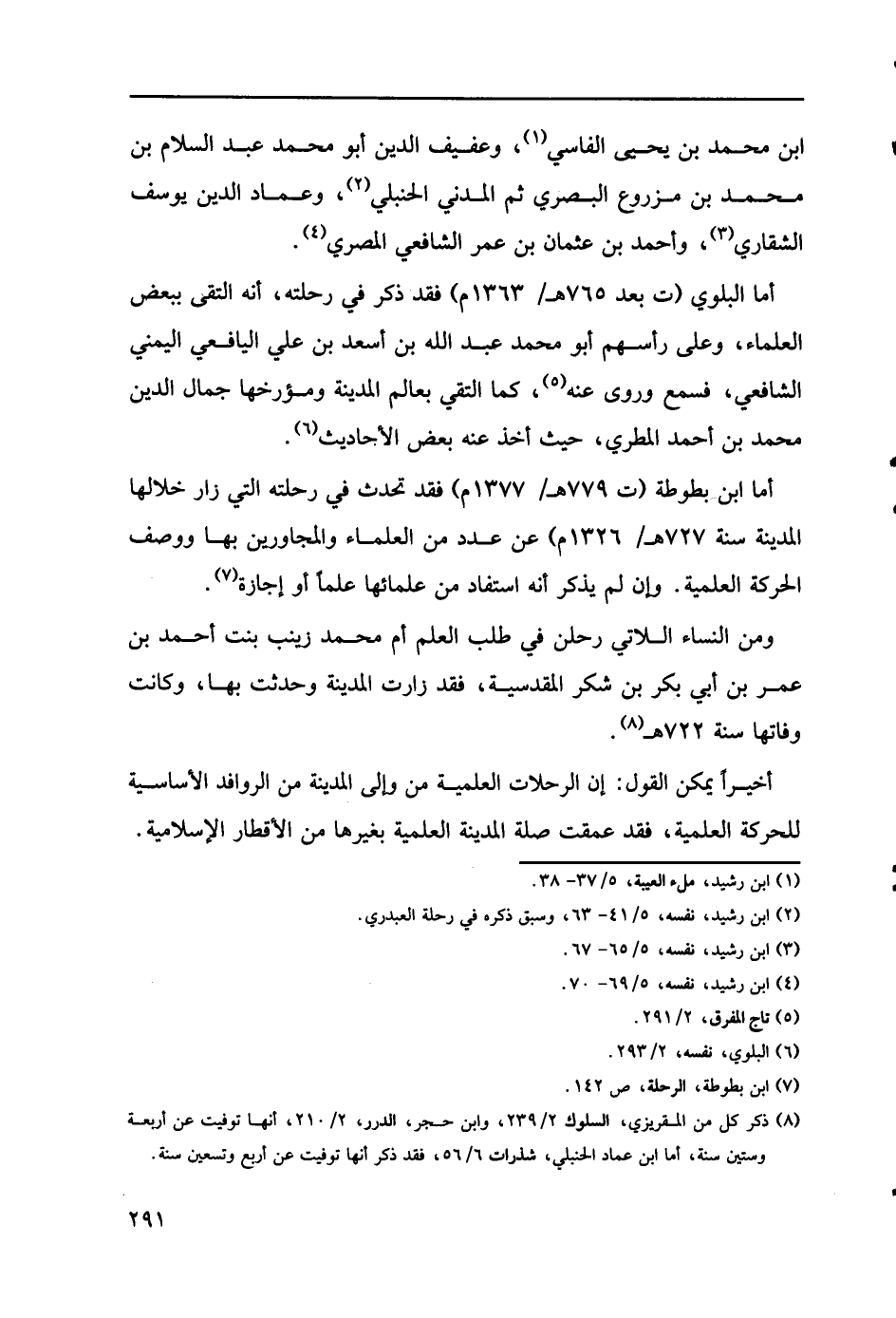 أما ابن بطوطة (ت779هـ/1377م) فقد تحدث في رحلته، التي زار خلالها المدينة سنة 727هـ/1326م) عن عدد من العلماء والمجاورين بها ووصف الحركة العلمية. وإن لم يذكر أنه استفاد من علمائها علماً أو إجازة (7).