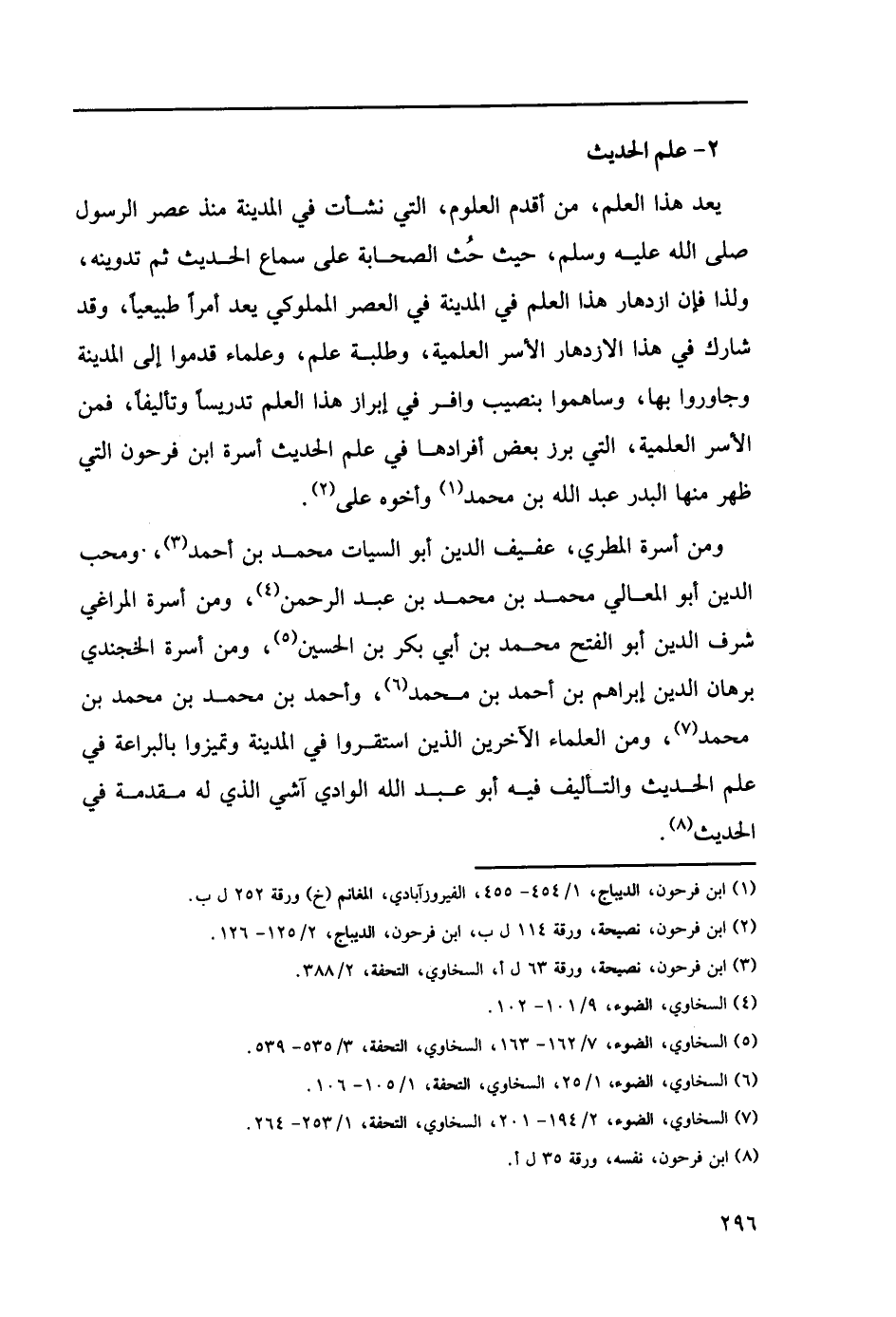 يعد هذا العلم، من أقدم، العلوم، التي نشأت في المدينة منذ في المدينة منذ عصر الرسول صلى الله عليه وسلم، حيث حث الصحابة على سماع الحديث ثم تدوينه، ولذا فإن ازدهار هذا العلم في المدينة في العصر المملوكي يعد أمراً طبيعياً، وقد شارك في هذا الازدهار الأسر العلمية، وطلبة علم، وعلماء قدموا إلى المدينة وجاوروا بها، وساهموا بنصيب وافر في إبراز هذا العلم تدريساً وتأليفاً، فمن الأسر العلمية، التي برز بعض أفرادها في علم الحديث أسرة ابن فرحون التي ظهر منها الدر عبد الله بن محمد (1) وأخوه علي (2).