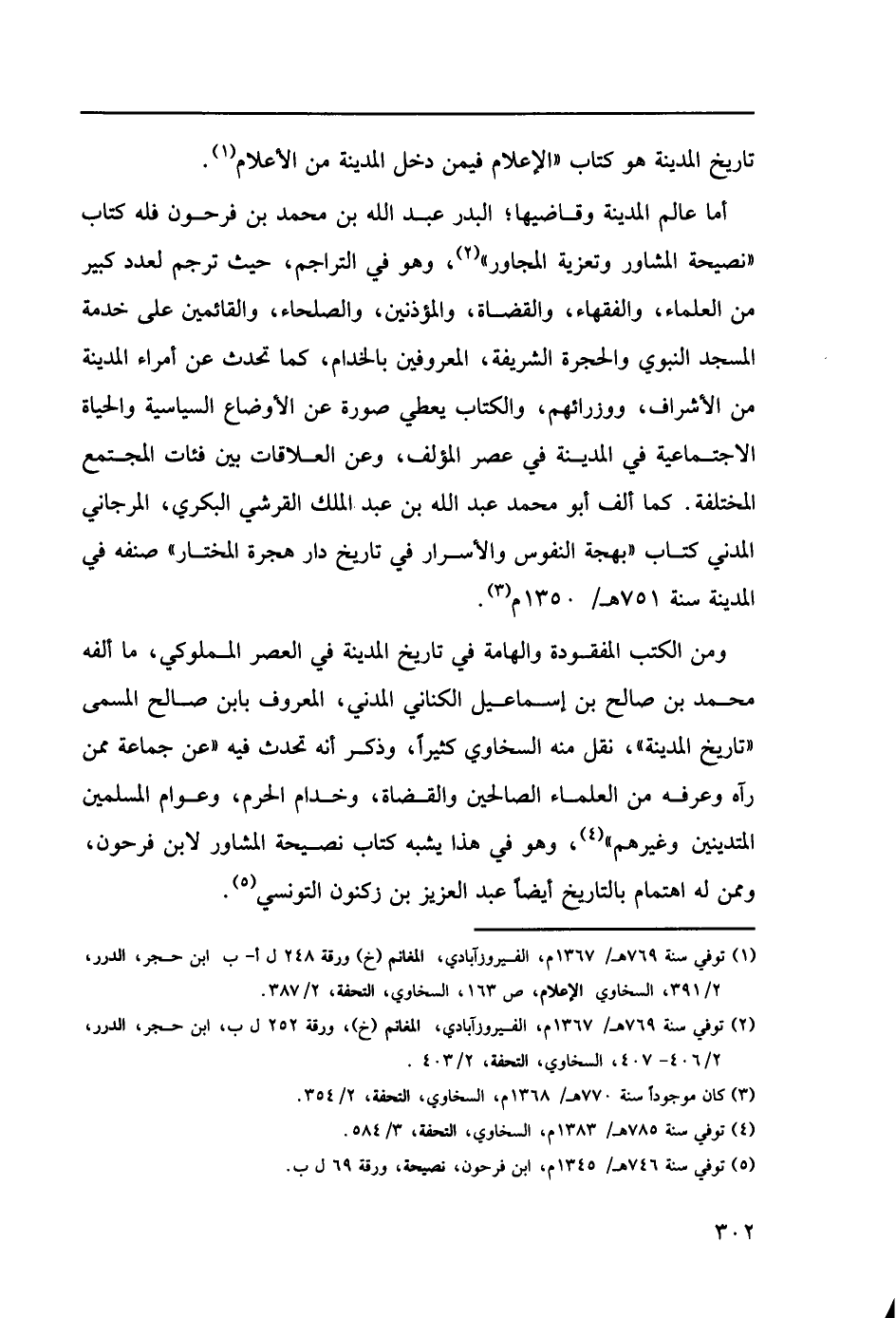 أما علم المدينة وقاضيها؛ البدر عبد الله بن محمد بن فرحون فله كتاب"نصيحة المشاور وتعزية المجاور" (2)، وهو في التراجم، حيث ترجم لعدد كبير من العلماء، والفقهاء، والقضاة، والمؤذنين، والصلحاء، والقائمين على خدمة المسجد النبوي والحجر الشريفة، المعروفين بالخدام، كما تحدث عن أمراء المدينة من الأشراف، ووزرائهم، والكتاب يعطي صورة عن الأوضاع السياسية والحياة الجتماعية في المدينة في عصر المؤلف، وعن العلاقات بين فئات المجتمع المختلفة. كما ألف أبو محمد عبد الله بن عبد الملك القرشي البكري، المرجاني المدني كتاب " بهجة النفوس والأسرار في تاريخ هجرة المختار" صنفه في المدينة سنة 751هـ/1350م (3).