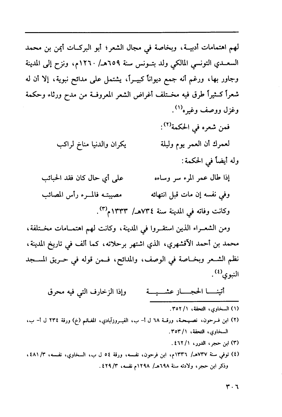 (4) توفي سنة 737هـ/1336م، ابن فرحون، نفسه، ورقة 54ل ب، السخاوي، نفسه، 481/ 3، وذكر ابن حجر، ولادته سنة 698هـ/1298م نفسه، 429/ 3.