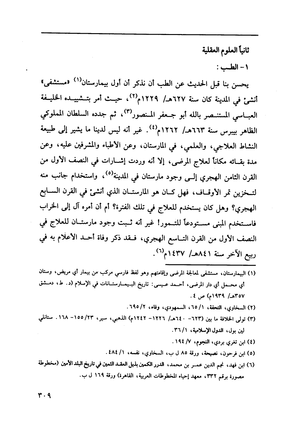(1) البيمارستان، مستشفى لمعالجة المرضى وإقامتهم وهو فارسي مركب من بيمار أي مريض، وستان أي محمل أي دار المرضى، أحمد عيسى: تاريخ البيمارستان في الإسلام (د. ط، دمشق 357هـ/1939م) ص 4.
