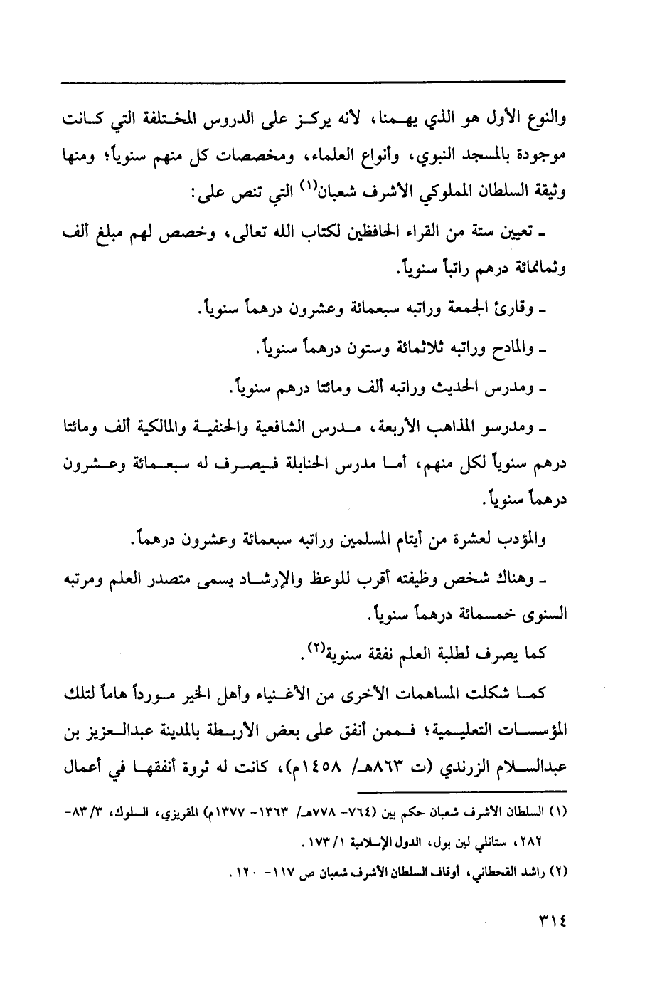 - ومدرسو المذاهب الأربعة، مدرس الشافعية والحنفية والمالكية ألف ومئتا درهم سنوياً لكل منهم، أما مدرس الحنبلية فيصرفله سبعمائة وعشرون درهماً سنوياً.