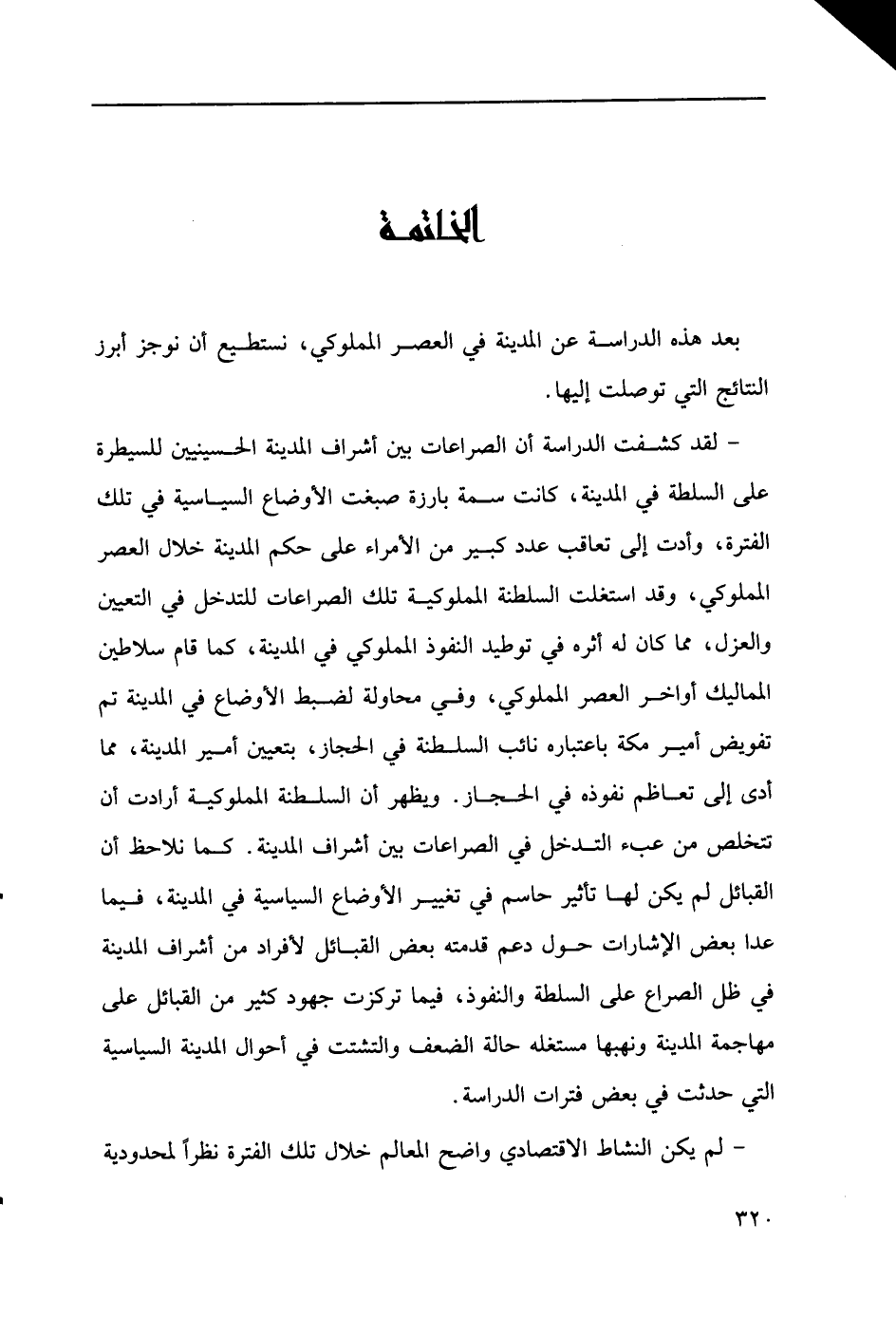 -لقد كشفت الدجراسة أن الصراعات بين أشراف المدينة الحسينيين للسيطرة على السلطة في المدينة، كانت سمة بارزة صبغت الأوضاع السياسية في تلك الفترة، وأدت إلى تعاقب عدد كبير من الأمراء على حكم المدينة خلال العصر المملوكي، وقد استغلت السلطنة المملوكية تلك الصراعات للتدخل في التعيين والعزل، مما كان له أثره في توطيد النفوذ المملوكي في المدينة، كما قام سلاطين المماليك أواخر العصر المملوكي، وفي محاولة لضبط الأوضاع في المدينة تم تفويض أمير مكة باعتباره نائب السلطنة في الحجاز، بتعيين أمير المدينة، مما أدى إلى تعاظم نفوذه في الحجاز. ويظهر أن السلطنة المملوكية أرادت أن تتخلص من عبء التدخل في الصراعات بين أشراف المدينة. كما نلاحظ أن القبائل لم يكن لها تأثير حاسم في تغيير الأوضاع السياسية في المدينة، فيما عدا بعض الإشارات حول دعم قدمته بعض القبائل لأفراد من أشراف المدينة في ظل الصراع على السلطة والنفوذ، فيما تركزت جهودكثير من القبائل على مهاجمة المدينة ونهبها مستغلة حالة الضعف والتشتت في أحوال المدينة السياسية التي حدثت في بعض فترات الدراسة.