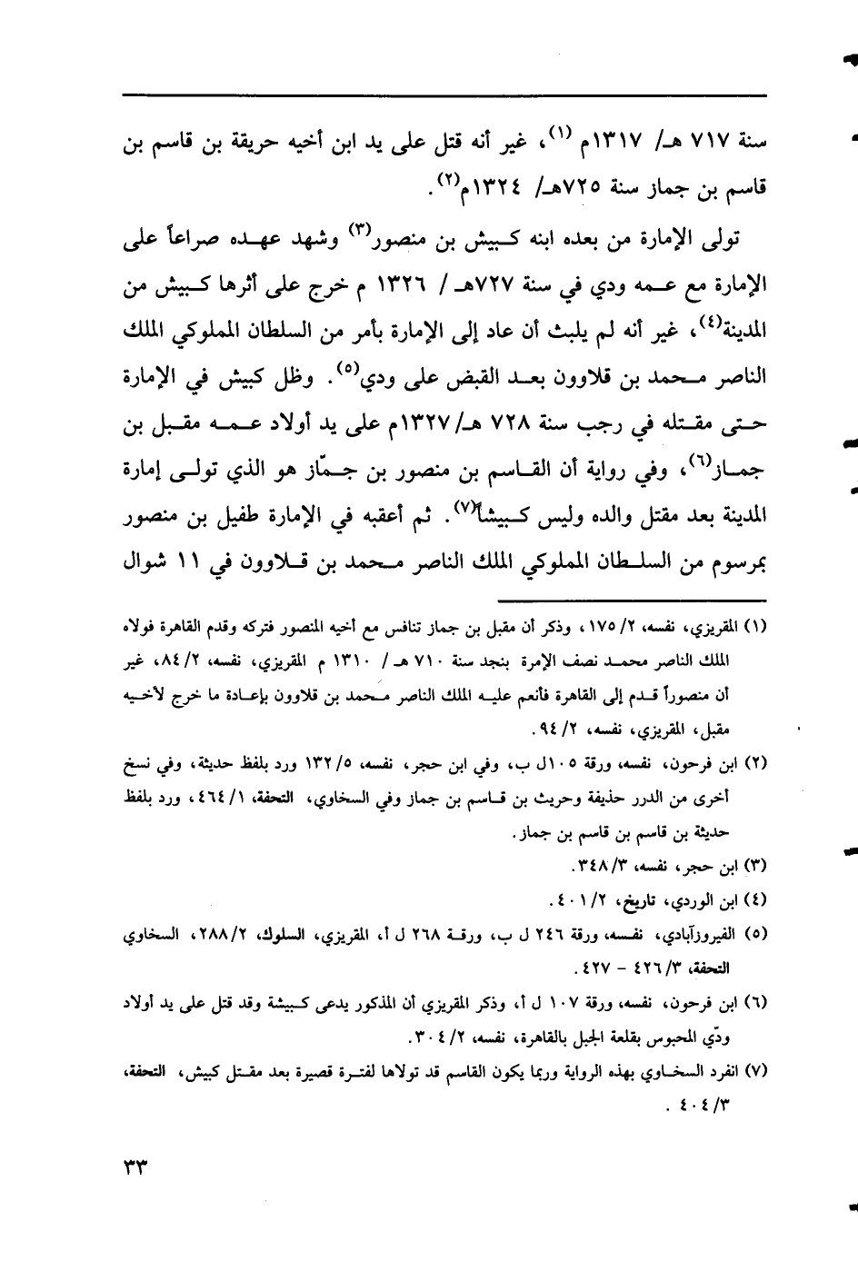 (2) ابن فرحون، نفسه، ورقة 105 ل ب، وفي ابن حجر، نفسه، 132/ 5 ورد بلفظ حديثة، وفي نسخ أخرى من الدرر حذيفة وحريث بن قاسم بن جماز وفي السخاوي، التحفة، 464/ 1، ورد بلفظ حديثة بن قاسم بن قاسم بن جماز.