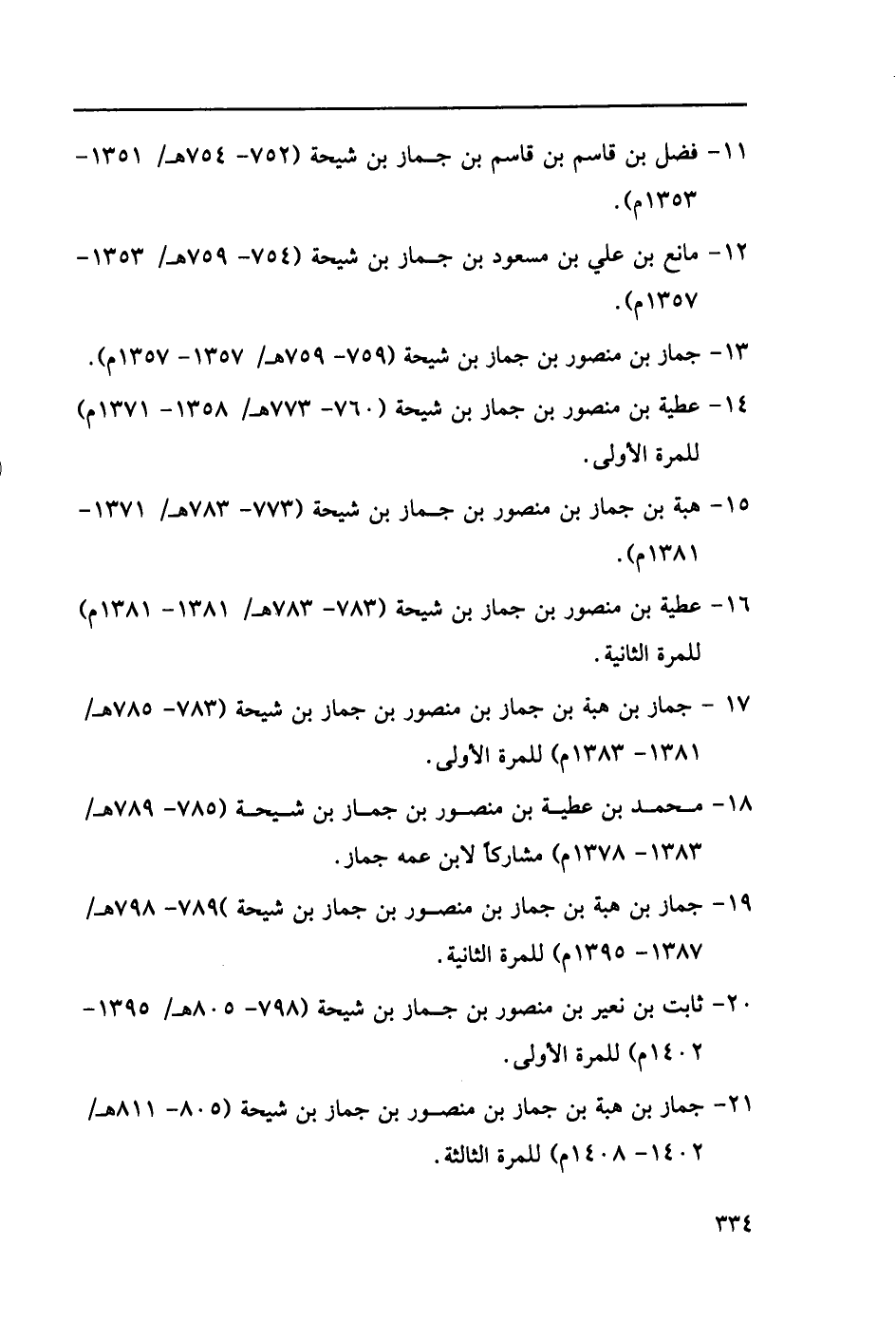 21 - جماز بن هبة بن جماز بن منصور بن جماز بن شيحة (805 - 811هـ/1402 - 1408م) للمرة الثانية.…