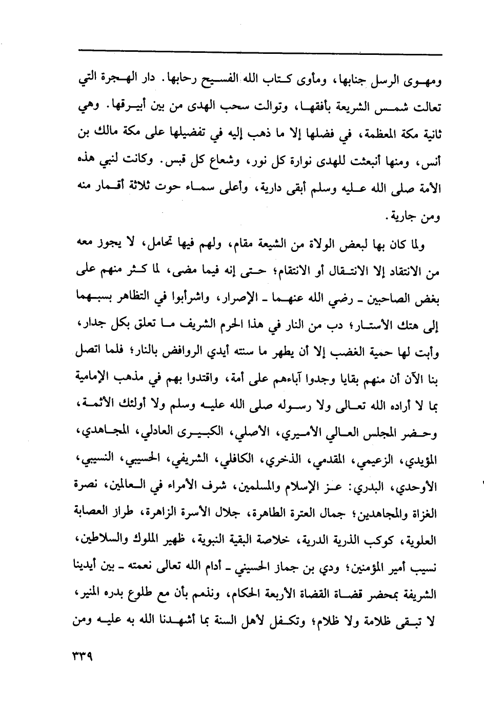 ولما كن بها لبعض الولاة من الشيعة مقام، ولهم فيها تحامل، لا يجوز معه من الإنتقاد إلا الانتقال أو الأنتقام؛ حتى إنه فيما مضى، لما كثر منهم على بغض الصاحبين-رضي الله عنهما- الإصرار، واشربوا في التظاهر بسبهما إلى هتك الأستار؛ دب من النار في هذا الحرم الشريف ما تعلق بكل جدار، وأبت لها حمية الغضب إلا أن يطهر ما سنته أيدي الروافض بالنار؛ فلما اتصل بنا الآن أن منهم بقايا وجدوا آباءهم على أمة، واقتدوا بهم في مذهب الإمامية بما لا أراده الله تعالى ولا رسوله صلى الله عليه وسلم ولا أولئك الأئمة، وحضر المجلس العالي الأميري، الأصلي، الكبيرى العادلي، المجاهدي، المؤيدي، الزعيمي، المقدمي، الذخري، الكافلي، الشريفي، الحسيبي، النسيبي، الأوحدي، البدري: عز الإسلام والمسلمين، شرف الأمراء في العالمين، نصرة الغزاة والمجاهدين؛ جمال العترة الطاهرة، جلال الأسرة الزاهرة، طراز العصابة العلوية، كوكب الذرية الدرية، خلاصة البقية النبوية، ظهير الملوك والسلاطين، نسيب أمير المؤمنين؛ ودي بن جماز الحسيني-أدام الله تعالى نعمته- بين أيدينا الشريفة بمحضر قضاة القضاة الأربعة الحكام، ونذم بأن مع طلوع بدره المنير، لا تبقى ظلامة ولاظلام؛ وتكفل لأهل السنة بما أشهدنا الله به عليه ومن…