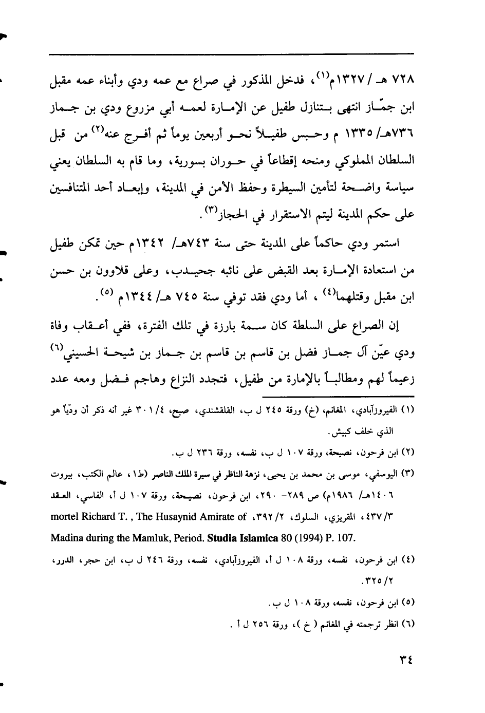 728هـ/1327م (1)، فدخل المذكور في صراع مع عمه ودي وأبناء عمه مقبل ابن جمّاز انتهى بتنازل طفيل عن الإمارة لعمه أبي مزروع ودي بن جماز 736هـ/1335م وحبس طفيلاً نحو أربعين يوما ثم أفرج عنه (2) من قبل السلطان المملوكي ومنحه إقطاعاً في حوران بسورية، وما قام به السلطان يعني سياسة واضحة لتأمين السيطرة وحفظ الأمن في لمدينة، وإبعاد أحد المتنافسين على حكم المدنية ليتم الاستقرار في الحجاز (3).